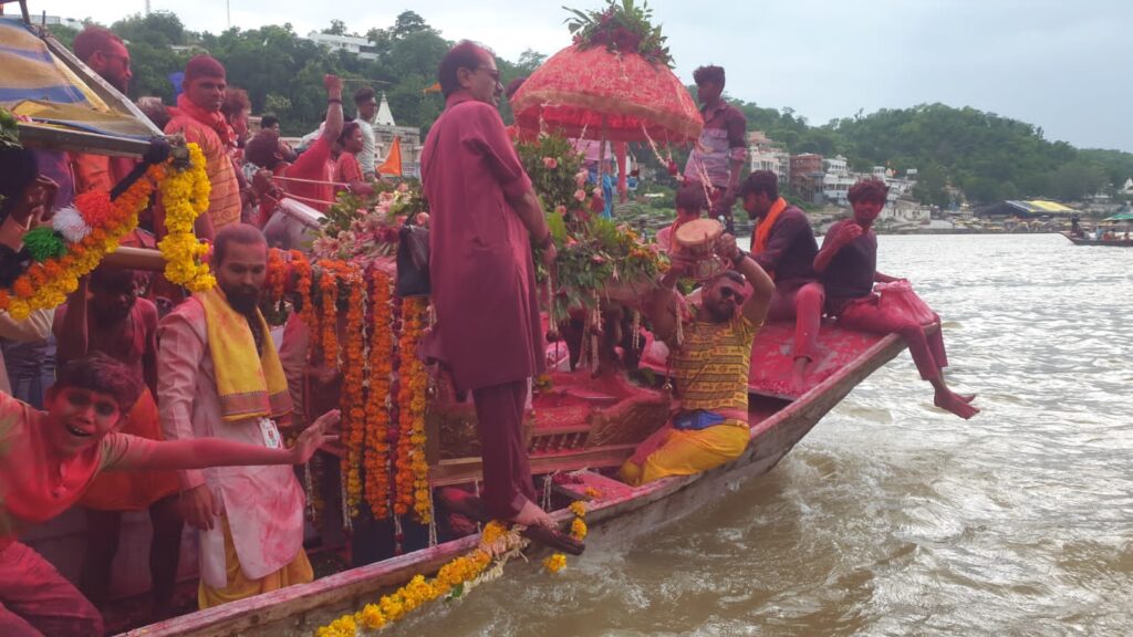 ओमकारेश्वर रविवार अवकाश का दिन , श्रावण सोमवार, अधिक मास के शुभ संयोग पर ओमकारेश्वर ज्योतिर्लिंग की सवारी  दर्शन के साथ जल और बेलपत्र अर्पित करने के लिए लाखों भक्तों को कारेश्वर पहुंच रहे हैं I ओम्कारेश्वर ज्योतिर्लिंग दर्शन के लिए प्रातः 4:00 बजे से ही  श्रद्धालुओं की लंबी कतारें पुराने झूला  और नए झूला पुल दोनों रास्तों पर लग रही हैं I दो दिनों में 2 लाख से अधिक श्रद्धालुओं ने ओंकारेश्वर ज्योतिर्लिंग दर्शन का पुण्य लाभ प्राप्त किया I  दोपहर 2 बजे ज्योतिर्लिंग भगवान ओंकारजी महाराज की पालकी मंदिर से रवाना हुई ओंकारेश्वर मंदिर परिसर से दोपहर 2:00 बजे ढोल धमाकों के साथ भोले शंभू भोलेनाथ का जय जयकार करते हुए ओम्कारेश्वर ज्योतिर्लिंग महाराज की सवारी कोटितीर्थ घाट पर पहुंची।घाट पंडित राजेश्वर दीक्षित के आचार्यत्व मे विद्वान पंडितों के द्वारा पंचमुखी रजत प्रतिमा का 251 लीटर दूध, दही,शहद, पंचामृत से महाअभिषेक पूजन संपन्न किया गया दक्षिण तट पर श्री ममलेश्वर भगवान की पालकी गोमुख घाट पर आई घाट पर श्री ममलेश्वर भगवान का विद्वान पंडितों के द्वारा अभिषेक करवाया गया पवित्र नर्मदा नदी में नौका विहार करने के बाद गौमुखघाट पर उत्तरी गणगौर घाट गांधी चौक होते हुए मेन मार्केट से जेपी चौक पुराने पुल होते हुए मुख्य बाजार से रात्रि 10:00 बजे वापस मंदिरों में पहुंची ।मार्ग में भक्तों के द्वारा गुलाब की पंखुड़ियां उड़ा कर भगवान का भोलेनाथ का भव्य स्वागत किया ,और ढोल धमाकों की थाप पर भोले शंभू भोलेनाथ का उद्घोष करते हुए खूब नाचे कपूर आरती कर अभिवादन किया प्रशासन के पुख्ता प्रबंध थे।ओमकारेश्वर सवारी के कोठी तीर्थ घाट पर राजा मांधाता पुष्पेंद्र सिंह तथा मंदिर ट्रस्ट के जंग बहादुर सिंह ने घाट पर भगवान ओमकारेश्वर सवारी की पूजा अर्चना की।मांधाता के पूर्व विधायक लोकेंद्र सिंह के परिवार ने विजय बहादुर सिंह तोमर लाला भैया उनकी पत्नी और मां ने घाट पर पूजा अर्चना की। भगवान की सवारी जेपी चौक से गोमुख घाट होते हुए ममलेश्वर अपने स्थान पर पहुंची तथा जेपी चौक से ओमकारेश्वर की महा सवारी पुराने झूला पुल होते हुए ओमकारेश्वर मंदिर अपने स्थान पर पहुंची तथा बाद में ओमकारेश्वर मंदिर के श्रृंगार के दर्शन लाखों श्रद्धालुओं ने दर्शन करके प्रभु से अमन चैन शांति और उज्जवल भविष्य की कामना की। चौथी सवारी में युवाओं और महिलाएं खूब जोश से नाचे भगवान के भजन गाते हुए धार्मिक नगरी में धर्मार्थ आनंदित माहौल प्रभु उद्घोष से भक्तों को और श्रद्धालुओं ने शिव भक्ति में मदहोश कर दिया।वहीं प्रशासन ने पैनी निगाहों से जो मुख्य नगर में थाना मांधाता ने कैमरे से निगरानी रखी गई, ।