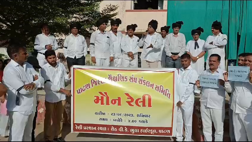 પાટણ જિલ્લાની 141 શાળા ના શિક્ષકોઓ વી કે ભૂલ સ્કૂલ થી બગવાડ દરવાજા સુધી શિક્ષકો ની વિવિધ પડતર માંગને લઈ સફેદ વસ્ત્રો અને કાળી પટ્ટી ધારણ કરી મૌન રેલી યોજી જેમાં મોટી સંખ્યામાં શિક્ષકો જોડાયા