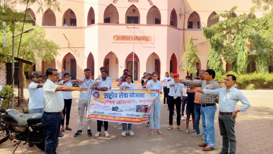 बड़वानी 31 मई 2024/शहीद भीमा नायक शासकीय स्नातकोत्तर महाविद्यालय बड़वानी की राष्ट्रीय सेवा योजना इकाइयों के द्वारा प्राचार्य डॉ.दिनेश वर्मा एवम् जिला संगठन रा. से .यों .डॉ. आर.एस. मुजाल्दा के निर्देशानुसार तंबाखू निषेध दिवस के उपलक्ष्य में रैली का आयोजन कार्यक्रम अधिकारी डॉ. रणजीत सिंह मेवाडे एवं डॉ.राजमल सिंह राव के मार्ग दर्शन में किया गया । रैली के पूर्व सभी ने नशा मुक्ति की शपथ ली, उक्त शपथ जिला चिकित्सालय के डॉक्टरों द्वारा दिलाई गई । जागरूकता रैली गायत्री परिवार एवं राष्ट्रीय सेवा योजना के संयुक्त तत्वाधान में आयोजित की गई । नशा मुक्ति जागरूकता रैली गायत्री मंदिर से प्रारंभ होकर झंडा चौक, मोटी माता चौराहा, चंचल चौराहा, पाला बाजार आदि स्थानों से होते हुए, वापस गायत्री मंदिर पहुंची। रैली के दौरान गायत्री परिवार के सदस्यों एवं राष्ट्रीय सेवा योजना के स्वयंसेवकों ने विभिन्न नशा मुक्ति नारों के माध्यम से लोगों को जागरूक करने का प्रयास किया। नशा नर्क का द्वार है नशा करने से कई परिवार उजड़ जाते हैं ।
