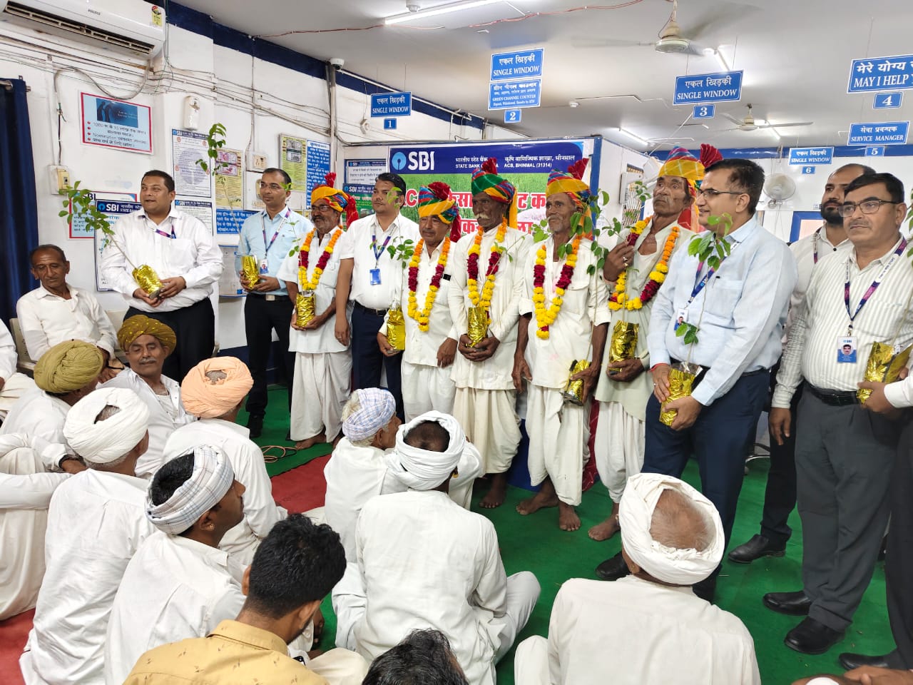 भीनमाल । भारतीय स्टेट बैंक कृषि विकास शाखा द्वारा किसानों के फैसले नवीनीकरण हेतु विशेष शिविर का आयोजन किया गया । इस उपलक्ष में बैंक की तरफ से 121 किसानों के ऋण का नवीनीकरण किया गया । उन्हें नवीनीकरण पर मिलने वाले सब्सिडी ब्याज व फसल बीमा के बारे में विस्तृत जानकारी प्रदान की गई । बैंक द्वारा 75 वर्ष के ऊपर पिछले 10 से 15 साल में लगातार रिनुअल करने वाले नियमित किसानों का माल्यार्पण व साफा पहनकर स्वागत किया गया । इस अवसर पर बैंक के स्टाफ द्वारा ग्राहकों को दी जाने वाली सोलर ऋण, कृषि आधारभूत ऋण, तारबंदी, ट्यूबवेल, गोल्ड लोन व कृषि हेतु सहित अन्य कार्यों के दिए जाने वाले ऋण के बारे में विस्तृत जानकारी प्रदान की गई । बैंक की विभिन्न योजनाओं पर किसानों को होने वाली फायदे और सब्सिडी के बारे में केंद्र व राज्य सरकार द्वारा दी जाने वाली योजनाओं के बारे में जानकारी दी गई ।  जिसका किसानों ने बहुत-बहुत आभार व्यक्त किया और इसका संपूर्ण फायदा लेने का आश्वासन दिया । बैंक द्वारा किसानों को अपने हित में जागरूक रहने के लिए विशेष निवेदन किया गया । उन्हें सरकारी योजनाओं का लाभ मिल सके इसलिए उन्हें नियमित रूप से बैंक के सम्पर्क में रहने को भी कहा गया ।  बैंक के स्टाफ द्वारा प्रधानमंत्री सुरक्षा बीमा योजना, प्रधानमंत्री जीवन ज्योति बीमा योजना, अटल पेंशन योजना, सेविंग खातों में और एटीएम में दी जाने वाली बैंक द्वारा एक्सीडेंटल बीमा योजना के बारे में भी जानकारी प्रदान की गई । वर्तमान में परिवर्तन हो रहे पर्यावरण के असंतुलन को ध्यान में रखते हुए बैंक द्वारा किसानों को वृक्षारोपण, जल संरक्षण व पर्यावरण के प्रति सचेत रहने व जागरूकता के बारे में भी बताया गया । किसान हमारे पर्यावरण का एक सच्चा हितैषी है । इसलिए सभी उपस्थित किसानों को 150 पौधों का वितरण किया गया । उनसे आग्रह किया गया कि  पौधारोपण कर उसका पालन पोषण वह करें । यह हमारा सौभाग्य रहा कि सभी किसानों ने सहर्ष स्वीकार करते हुए पौधों की देखरेख करने का जिम्मा उठाया ।  सभी ने 150 पेड़ लगाने का संकल्प लिया । इस अवसर पर सभी शाखाओं के स्टाफ एवं आरबीओ के स्टाफ सहित जोधपुर से चेतन गहलोत, मुख्य प्रबंधक कृषि उपस्थित थे । शाखा के प्रबंधक गंगा विशन द्वारा सभी स्टाफ और किसानों का धन्यवाद ज्ञापित किया गया । एसबीआई खारी रोड के मुख्य प्रबंधक किशनसिंह गहलोत द्वारा बताया गया कि बैंक से संबंधित अधिक जानकारी हेतु बैंक के टोल फ्री नंबर 18001234 और 1800 2100 पर भी जानकारी प्राप्त कर सकते हैं ।