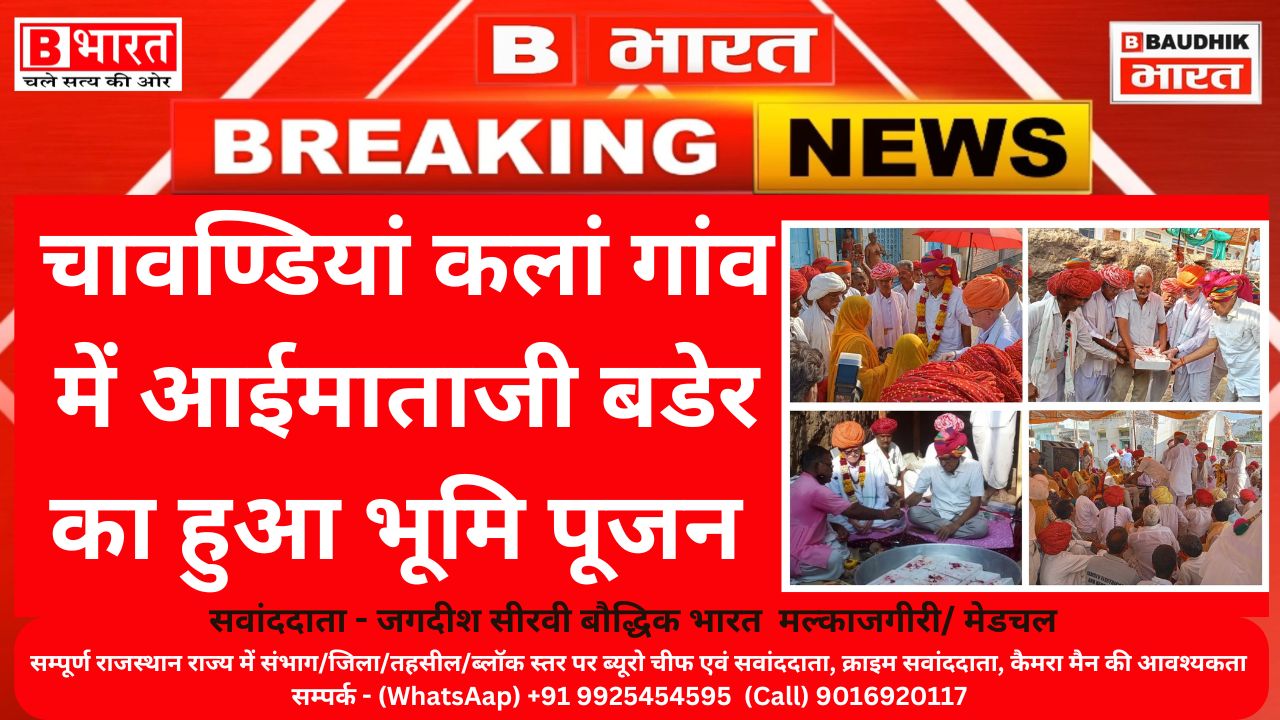 ब्यावर : जैतारण चावण्डिया कलां में स्थित आईमाता मंदिर का भूमि पूजन कार्यक्रम आयोजित किया। भजन संध्या का आयोजन हुआ जिसमें भजन गायक पप्पू पुरी गोस्वामी अटबडा ने भजनों की प्रस्तुतियां दी। इस अवसर पर सीरवी समाज के धर्मगुरु दीवान माधुव सिंह द्वारा भुमि पुजन किया है बडेर के कोटवाल दुर्गाराम परिहार,जिम्मेदारी मंगलाराम हाम्बड़, पंच ओगड़राम पंवार , नारायण लाल मुलेवा, ओगड़राम राठौड़, नारायण लाल हाम्बड़ , भंवरलाल मुलेवा, हापुराम चोयल, बाबूलाल काग, मांगीलाल गहलोत , भंवरलाल पंवार , मांगीलाल परिहार , गेनाराम सोलंकी , बाबूलाल सोलंकी , धीराराम पंवार , नारायण लाल सोलंकी, सुगाल हाम्बड़, हीराराम परिहार, बाबूलाल बर्फा, दुदाराम परिहार,प्रभुराम चोयल,उर्जाराम हाम्बड़ , ढगलाराम बर्फा व समाज बन्धु उपस्थित रहे।