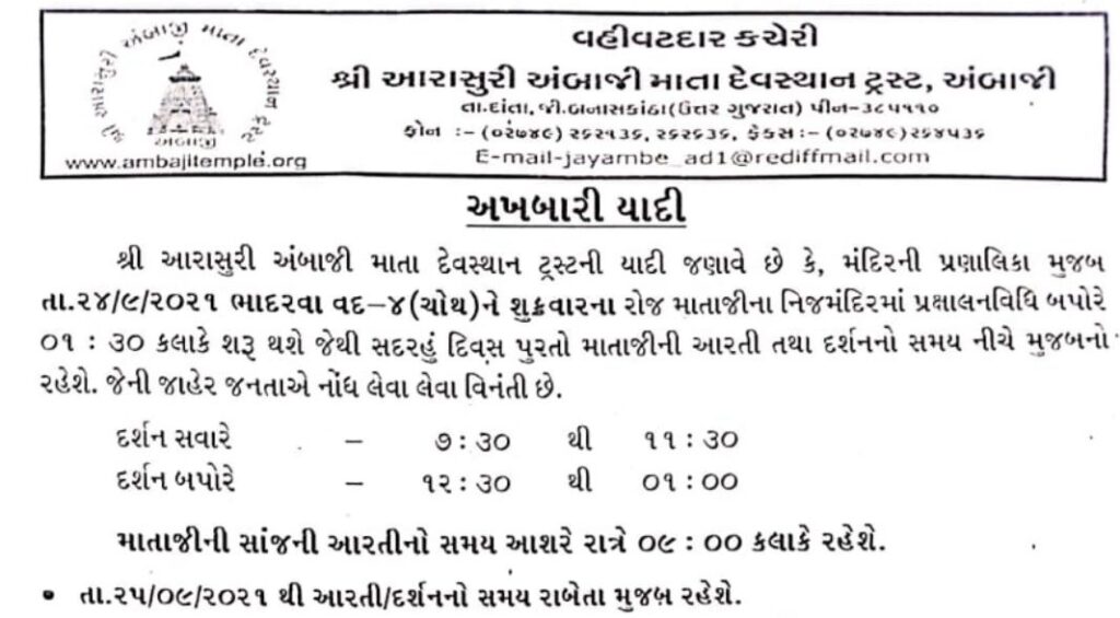 પ્રસિદ્ધ અંબાજી મંદિર માં તારીખ 24/ 9/2021 ના રોજ નિજમંદિરમાં પ્રક્ષાલન વિધિ ના ભાગ રૂપે દર્શન સમય માં ફેરબદલ કરવામાં માં આવ્યો