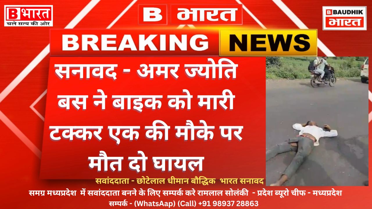 सनावद शुक्रवार शाम करीब 5 बजे इंदौर की ओर से आ रही अमर ज्योति बस क्रमांक MP.10.P.9195 सनावद की ओर से जा रहे बाइक क्रमांक MP.47.ZA.5333 की राधा स्वमी के पास आमने सामने टक्कर हो गई। इस हादसे में एक बाइक सवार की घटना स्थल पर मौत हो गई अन्य दो घायल हो गये। घायलों को एम्बुलेंस से बड़वाह सिविल अस्पताल पहुँचाया गया। ये तीनो राधेश्याम, अनार सिंह, बंसीलाल हरदा के रावेर खेड़ा छिपवाड़ा के बताये जा रहे हैं। आगे कार्यवाही हेतु मोरटक्का पुलिस चौकी ने बस जप्त कर ली है।