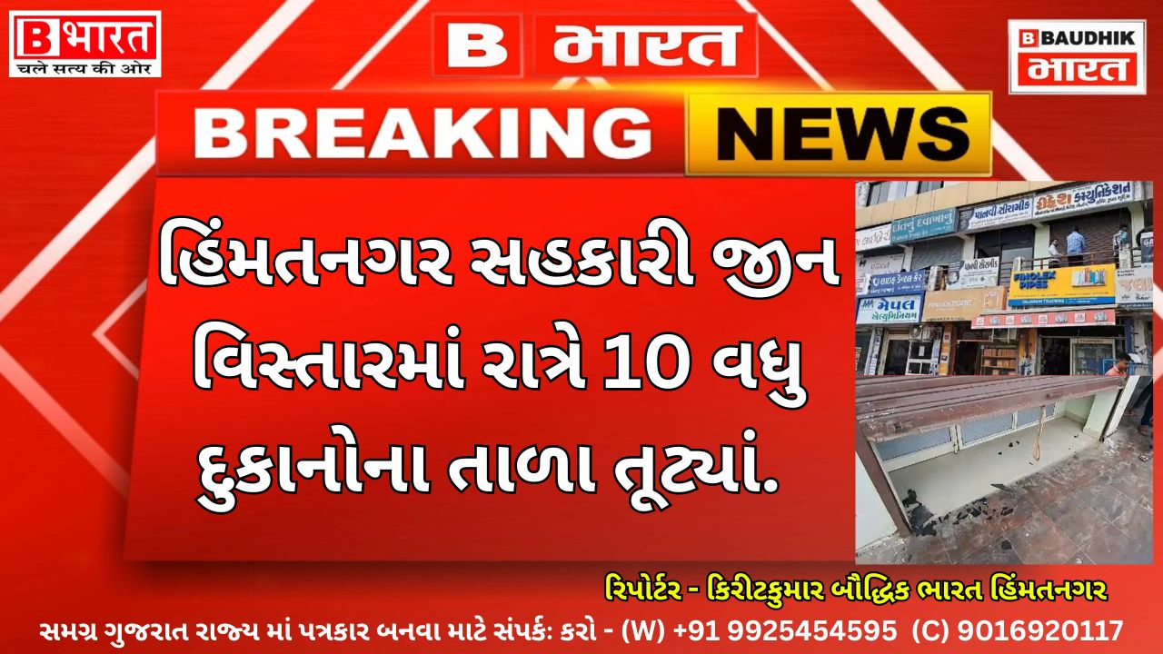 હિંમતનગર શહેરમાં સહકારી જીન વિસ્તારમાં આવેલા તુલસીકોમ્પ્લેક્સમાં આવેલી રસરાજ આયુર્વેદિક હોસ્પિટલ,ઉત્સવ ટાઇલ્સ, ક્રિષ્ના સેલ્સ સિમેન્ટ,વલ્લભ બોરવેલ,ઓમ સાંઈ વાન પાર્લર,અને પ્રોવિઝન,શાયોના પેથોલોજી લેબોરેટરી,નીરવ ટેક્નોલેજી,લાઈફ ડેન્ટલ કેર, પાનવી સીરામીક અને રિફ્રેશ કોમ્યુનિકેશન ને તસ્ક્રરો એ નિશાન બનાવ્યા હતા. આ ચોરી અંગેની જાણ એ ડીવીઝન પોલીસને થતાં ઘટના સ્થરે પહોંચી અને સમગ્ર ઘટના ની તપાસ સી.સી.ટીવીના આધારે હાથ ધરી હતી.