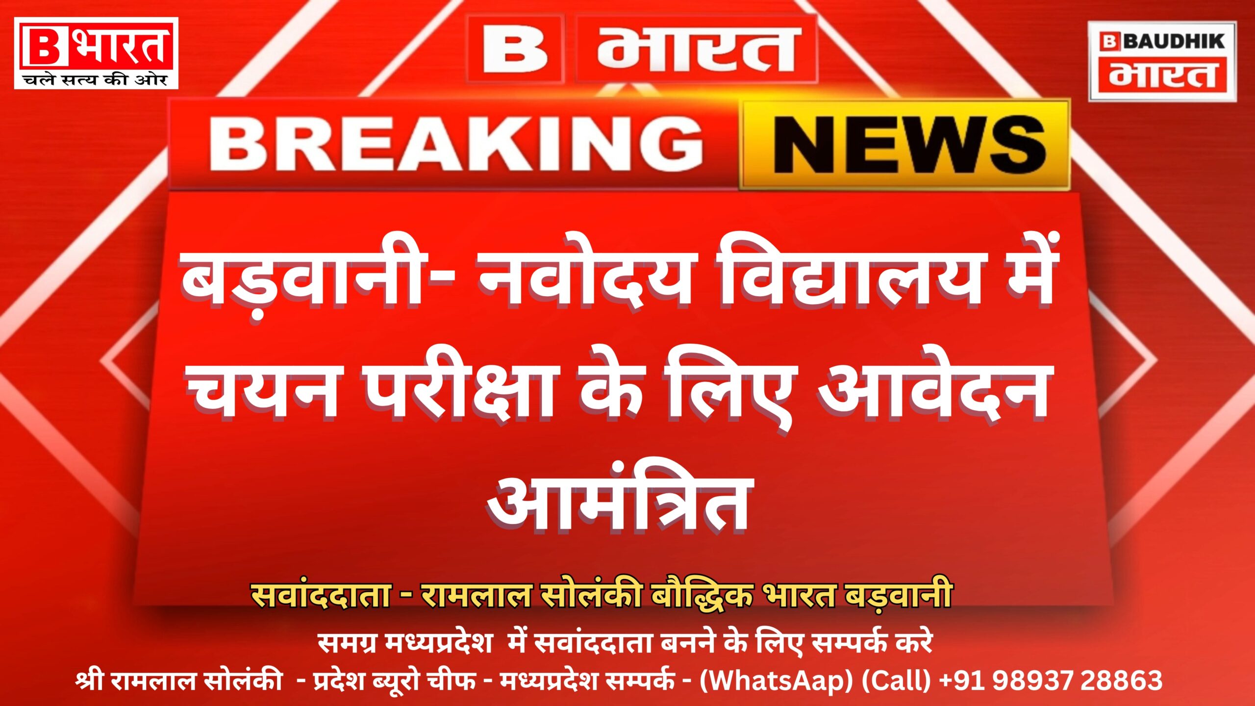 बड़वानी 29 जुलालई 2024/ जवाहर नवोदय विद्यालय ओझर में 2025 के लिए कक्षा 6वीं की 80 सीटों के लिए जवाहर नवोदय विद्यालय चयन परीक्षा के ऑनलाईन आवेदन पत्र आमंत्रित किए जा रहे है। कक्षा 6वीं के प्रवेश के लिए ऑनलाईन आवेदन भरने की अन्तिम तिथि 16 सितबंर 2024 है एवं चयन परीक्षा दिनांक 18 जनवरी 2025 को आयोजित होनी वाली है। संस्था प्राचार्य श्री एसडी भालसे से प्राप्त जानकारी अनुसार अभ्यर्थी बड़वानी जिले का वास्तविक निवासी हो और शैक्षणिक सत्र 2023-24 में कक्षा 05वीं में शासकीय/गैर शासकीय मान्यता प्राप्त विद्यालय में अध्ययनरत हो । अभ्यर्थी की जन्मतिथि 01.05.2013 से 31.07.2015 के बीच हो । विद्यार्थी ने कक्षा-तीसरी, 04 थी, 05 पॉचवी पूरा सत्र अध्ययन बड़वानी जिले के शासकीय एवं शासकीय मान्यता प्राप्त प्राथमिक विद्यालय में अध्ययनरत होना चाहिए वही विद्यार्थी फार्म भर सकते है । आवदेन ऑनलाईन www.navodaya.gov.in के माध्यम से किया जा सकता है।