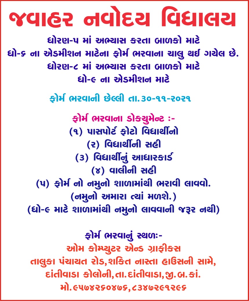 ધોરણ 5 માં અભ્યાસ કરતા બાળકો માટે જવાહર નવોદય માં ફોર્મ ભરવાનુઁ ચાલુ गुजरात By bauddhikbharatnews@gmail.com Last updated Sep 24, 2021 0 111 Share 0 111 Share