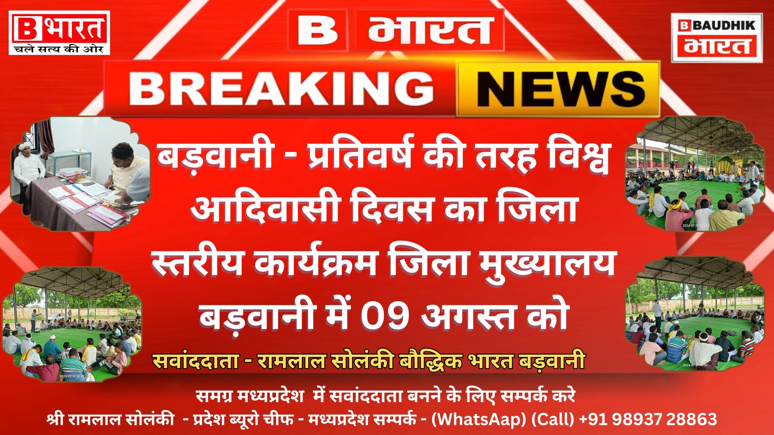 प्रतिवर्ष अनुसार इस बार भी विश्व आदिवासी दिवस का जिला स्तरीय कार्यक्रम जिला मुख्यालय बड़वानी में 09 अगस्त को बनाया जाएगा