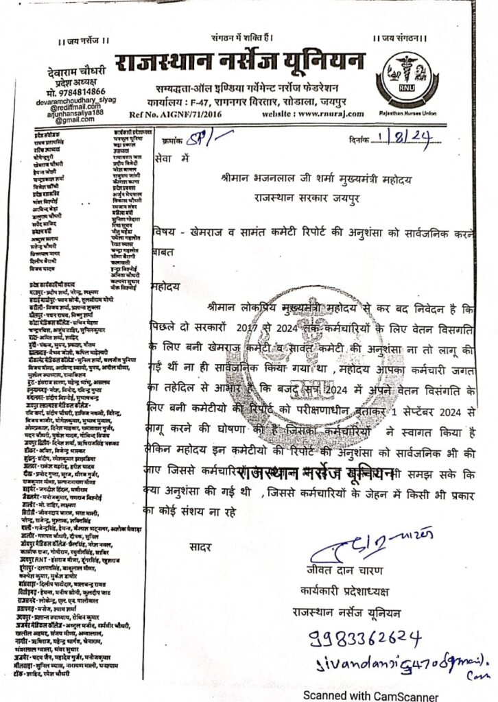 राजस्थान नर्सेज यूनियन के कार्यकारी प्रदेशाध्यक्ष जीवत दान चारण ने मुख्यमंत्री राजस्थान सरकार को ज्ञापन भेज कर रिपोर्ट सार्वजनिक करने की मांग की हैं ,कार्यकारी प्रदेशाध्यक्ष चारण ने बताया है कि लोकप्रिय मुख्यमंत्री भजनलाल शर्मा ने विधानसभा के पटल पर बजट सत्र में कर्मचारियों की चिरप्रतीक्षित मांग वेतन विसंगति के लिए बनी कमेटीयो की रिपोर्ट को लागू करने की विधानसभा में घोषणा की है जो पिछले दो सरकारों 2017 से 2023 तक कर्मचारियों के लिए वेतन विसगति के लिए बनी खेमराज कमेटी व सावंत कमेटी की अनुशंसा ना तो लागू की गईं थीं ना ही सार्वजनिक किया गया था , लेकिन कर्मचारियों की मुख्य मांग को मानते हुए बजट सत्र 2024 में अपने वेतन विसंगति के लिए बनी कमेटीयो की रिपोर्ट को परीक्षणाधीन बताकर 1 सेप्टेंबर 2024 से लागू करने की घोषणा की है जिसका कर्मचारियों ने स्वागत भी किया है लेकिन इन कमेटीयो की रिपोर्ट की अनुशंसा को सार्वजनिक भी की जाए जिससे कर्मचारियों के संज्ञान में रहे व कर्मचारी भी समझ सके कि क्या अनुशंसा की गई थी , जिससे कर्मचारियों के जेहन में किसी भी प्रकार का कोई संशय ना रहे , मुख्यमंत्री भजनलाल शर्मा इस को भी सार्वजनिक कर कर्मचारियों के किसी भी प्रकार के संशय को समाप्त कर 8 लाख कर्मचारियों को राहत देंगे ऐसा संगठन को विश्वास है , सरकार के द्वारा कमेटी की रिपोर्ट को लागू करने की घोषणा से लाखों कर्मचारियों ने खुशी व्यक्त की है।