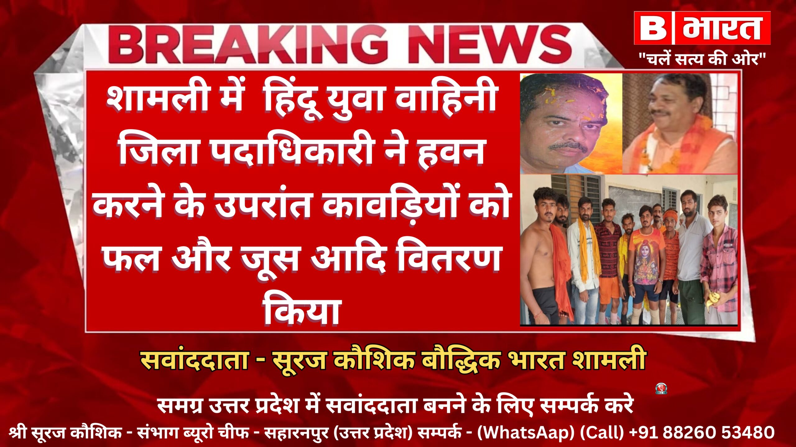 शामली में हिंदू युवा वाहिनी जिला पदाधिकारी ने हवन करने के उपरांत कावड़ियों को फल और जूस आदि वितरण किया