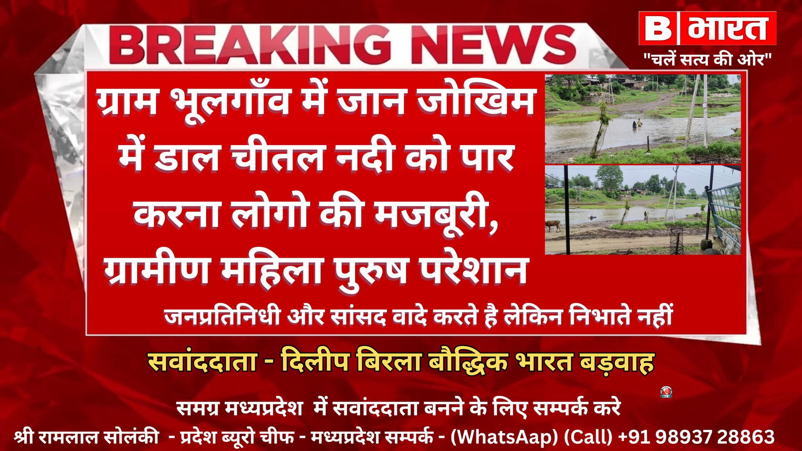 बड़वाह/ ग्राम भूलगाँव में चीतल नदी के उस पार जिन किसानों के खेत हैं उन्हें प्रतिदिन नदी की धारा पार कर अपने खेत देखने जाने की मजबूरी होती है नदी पार करने में हादसे भी होते हैं इस समस्या के समाधान का एक ही उपाय है कि यहां नदी पर पुल बना दिया जाए। और ग्राम में चीतल नदी के उस पार इस क्षेत्र के आधा दर्जन से ज्यादा गांवों के सैकड़ो किसानों की कृषि योग्य भूमि है। नदी पार कर खेती-किसानी के लिए प्रतिदिन जाना उनकी मजबूरी है। खेती के लिए किसानों को अपने जान की बाजी न लगानी पड़े, इसको लेकर आज तक कोई सार्थक पहल नहीं की गई है। किसानो को बैलगाड़ी से अपनी खेत से उपज लाने में बहुत परेशानी का सामना करना पड़ता है। नदी के किनारे बसे गांवों के किसानों ने कपास और मिर्ची की फसल नदी के उस पार खेतों में बोई है। पुरुष-महिलाएं कपड़े ऊपर कर रोज नदी पार जाना पड़ता है और शाम को वापस घर आते है। पानी के कारण मजदूर भी खेत में काम करने नहीं जाते है। गांवों के किसानो ने एक पुल की मांग करते आ रहे हैं। सुरेश बिर्ला, गजानंद, दिलीप छलोत्रा, दुर्गाराम पठान, जगदीश, सुरेन, हुकुम पुनासिया, महेश आदि ने बताया कि हम लोग आए दिन जान जोखिम में डालकर नदी उस पार जाते हैं ।