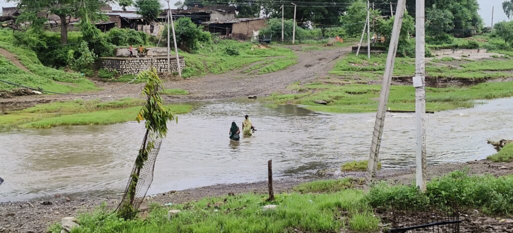 बड़वाह तहसील के ग्राम भूलगाँव में जान जोखिम में डाल नदी चीतल नदी को पार करना लोगो की मजबूरी, ग्रामीण महिला पुरुष परेशान