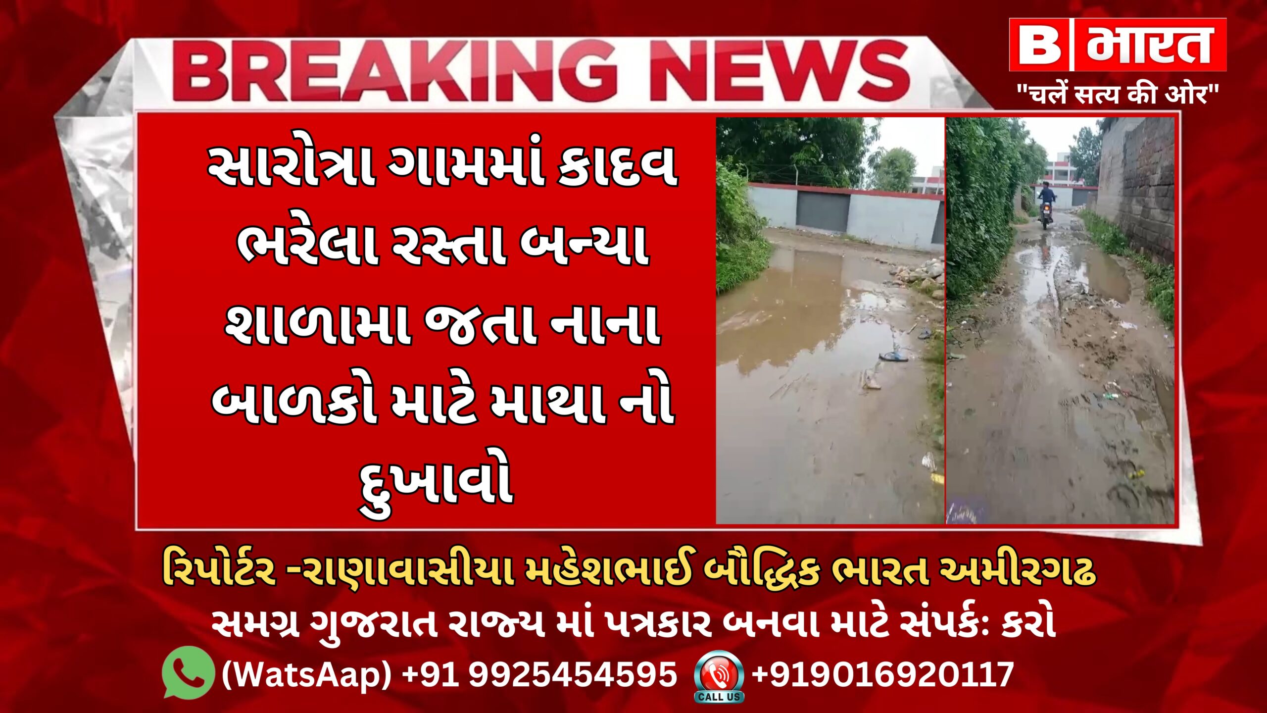 બનાસકાંઠા જિલ્લા ના અમીરગઢ તાલુકા નું સારોત્રા ગામમાં ગામનો વિકાશ ખુલો પડતો નજરે પડે છે નાજેવો થતો વરસાદ ગામના રસ્તાઓ ની હાલત ખરાબ કરે છે પણ ગ્રામ પંચાયત ને નજરે પડતું નથી આવા કાદવ ભરેલા રસ્તા થી શાળામા જતા નાના બાળકો ને ભારી મુશ્કિલો વેઠવી પડતી હોયે છે અને બાળકો ને આવા કાદવ ભરેલા રસ્તા મા ખૂબ જ મુશ્કેલીઓ થાય છે આવા કાદવ- કીચડ નાં લીધે નાના બાળકો નાં પગમાં ઇન્ફેક્શન પણ થઈ શકે છે.અને બાળક બીમાર પડી શકે છે જેથી ગ્રામ-જનોને દ્વારા વિનંતીકરવામાં આવે છે અને માંગ છે કે કઈક સફાઈ અથવા તો કાદવ નો યોગ્ય નિકાલ થાયે તો ગ્રામજનો અને નાના નાના બાળકો ને આ મુશ્કિલો ના વેઠવી પડે