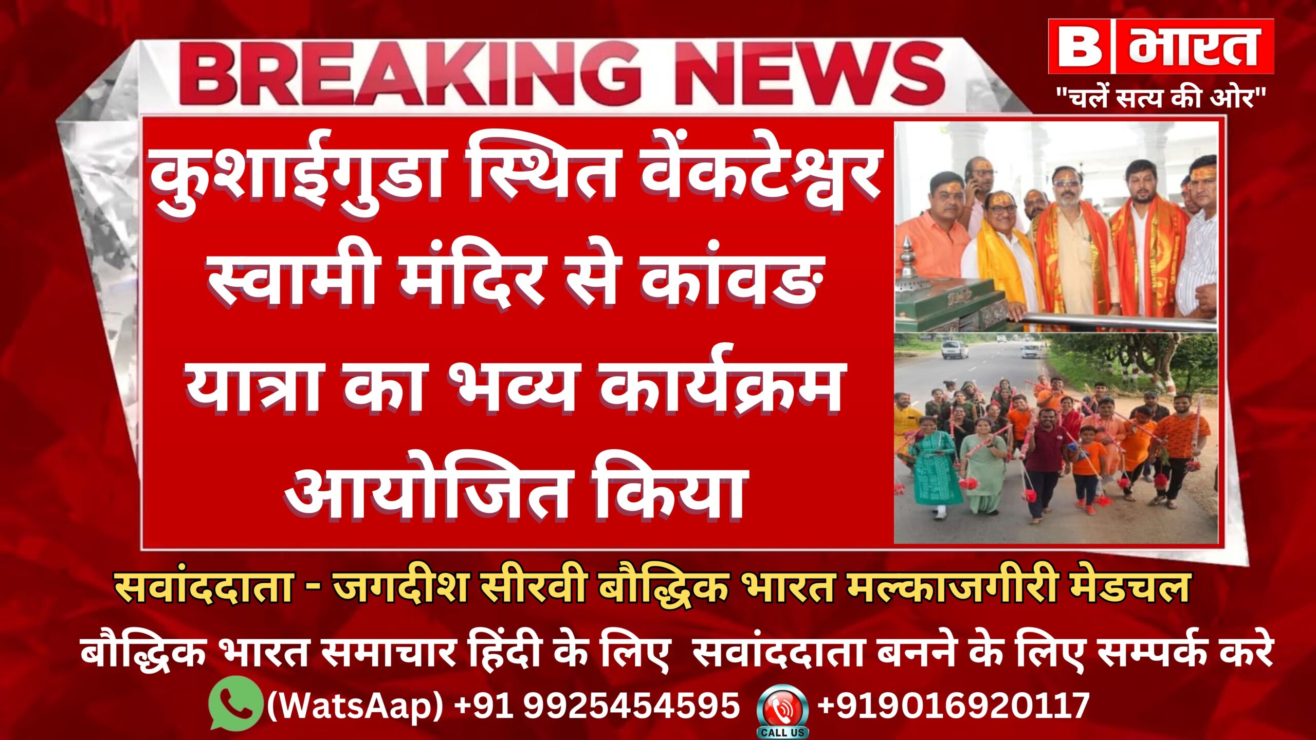 मल्काजगीरी /मेडचल : कुशाईगुडा स्थित वेंकटेश्वर स्वामी मंदिर कांवङ यात्रा से शंकर भगवान के उद्घघोष , झांकीयौं, भजनों के साथ किशरगुट्टा शिवालयम के लिए प्रस्थान करेगी जहां किशरगुट्टा कल्याण मण्डपम में भगवान भोले को भजऩों से रिझाने शिवभक्त राजेश जी शर्मा, मदन सिंह जी, मुरारी जी शर्मा अपनी प्रस्तुति देंगे। आप सब सपरिवार इष्ट मित्रों सहित पधारकर भजन रसपान एवं महा प्रसादी का आनंद लें इस अवसर पर मेडचल भारतीय जनता पार्टी प्रवक्ता राम प्रदीप, दामोदर शर्मा, जयप्रकाश शर्मा, आनंद शर्मा, कैलाश शर्मा, दुलीचन्द शर्मा,किशोर शर्मा,विकास शर्मा,मुरारी शर्मा, गोपाल चौधरी, गुमान सिंह राजपूत,शुभम शर्मा, महिला मंडल कमला देवी शर्मा, रेखा शर्मा, ममता शर्मा, मुनि शर्मा, प्रेमलता शर्मा, किरण शर्मा, मुनि बाई, विजयलक्ष्मी शर्मा, कमला शर्मा, सुशील शर्मा, कमला ललिता शर्मा,व समस्त शिव भक्त उपस्थित रहे।