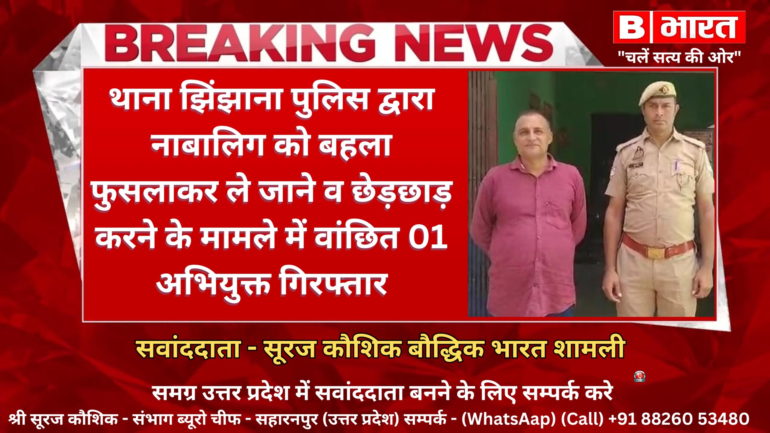 थाना झिंझाना पुलिस द्वारा नाबालिग को बहला फुसलाकर ले जाने व छेड़छाड़ करने के मामले में वांछित 01 अभियुक्त गिरफ्तार