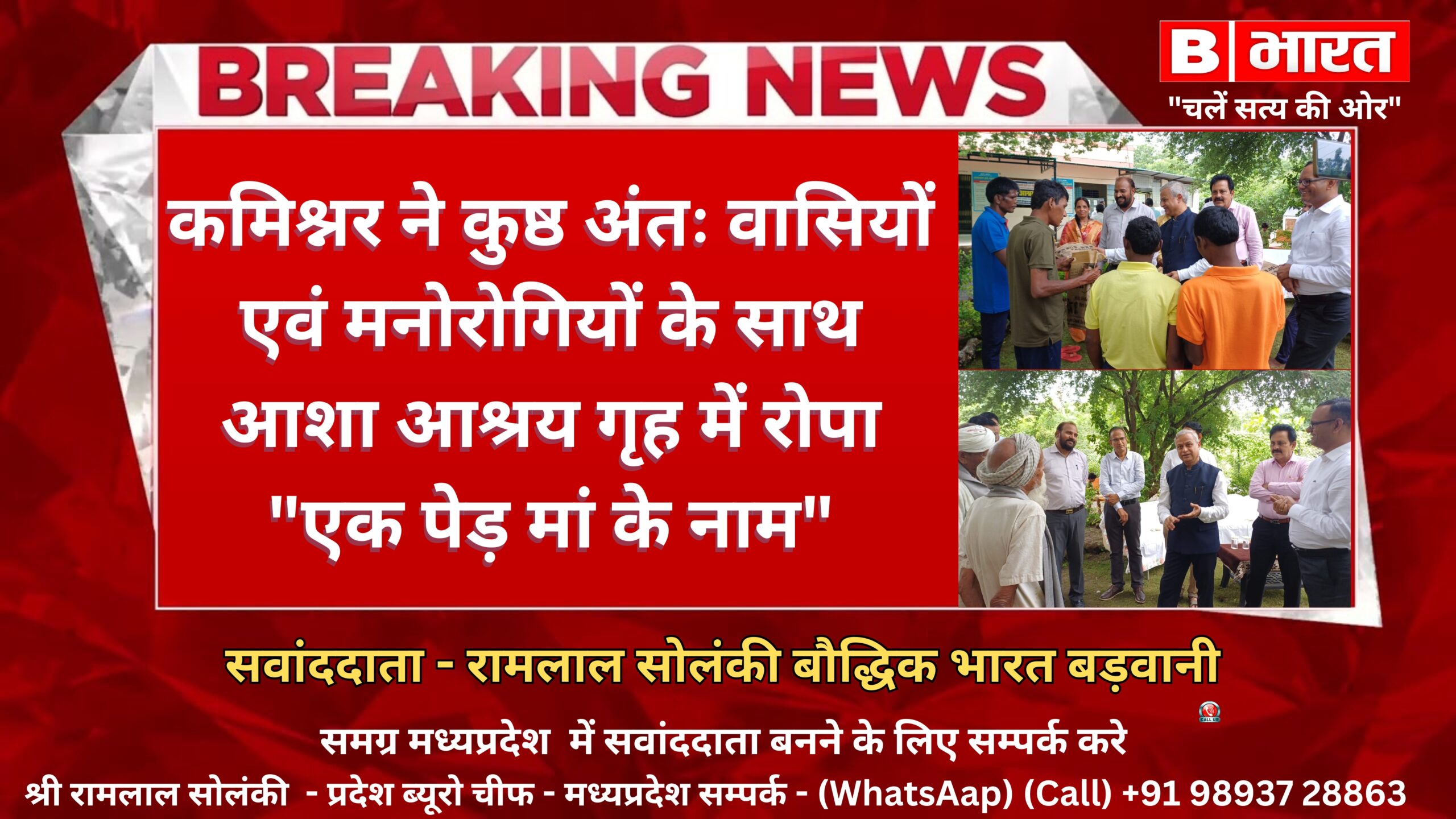 बड़वानी 08 अगस्त 2024/जिले में एक पेड़ मां के नाम अभियान जन-जन तक पहुंच रहा है यह पर्यावरण संरक्षण के लिए एक सुखद बयार है। उक्त बातें इंदौर संभाग आयुक्त श्री दीपक सिंह ने आशाग्राम ट्रस्ट द्वारा संचालित निराश्रित मानसिक रोगियों के आशा आश्रय गृह में त्रिवेणी रोपण करते हुए कही। संभाग आयुक्त श्री दीपक सिंह एवं कलेक्टर डॉ राहुल हरिदास फटिंग ने बुधवार को कुष्ठ अंतःवासियों एवं आशा आश्रय गृह के मनोरोगियों के साथ आशा इंस्टीट्यूट आफ नर्सिंग के विद्यार्थियों के साथ परिसर में त्रिवेणी रोपकर एक पेड़ मां के नाम पर 101 पौधे लगाने की शुरुआत की। आशा आश्रय गृह पहुंचने पर आयुक्त श्री दीपक सिंह का स्वागत नर्सिंग विद्यार्थियों ने तिलक लगाकर एवं मनोरोगियों के द्वारा स्वयं के हाथों से तैयार किए गए ग्रीटिंग कार्ड भेंट कर किया । आयुक्त श्री दीपक सिंह एवं कलेक्टर डॉ राहुल के द्वारा मनोरोगियों से संवाद कर ढाई साल की अल्पावधि में 34 मनोरोगियों के पारिवारिक पुनर्वास के कार्य को समाज के लिए प्रेरणादाई बताया। उन्होंने व्यावसायिक प्रतिष्ठान से जुड़े चौकसी वाला ज्वेलर्स के द्वारा समाज सेवा के क्षेत्र में वंचित वर्ग के लिए किए जा रहे कार्य की सराहना की। इस दौरान संभाग आयुक्त को कलेक्टर एवं अध्यक्ष आशाग्राम ट्रस्ट डॉ राहुल हरिदास फटिंग के द्वारा आशाग्राम ट्रस्ट द्वारा संचालित समस्त प्रकल्पों की जानकारी देकर सेवा कार्यों के विषय में बताया। इस दौरान जिला चिकित्सालय के डॉ मनीष मालवीय के द्वारा मनोरोगियों के उपचार के लिए जिला चिकित्सालय के समन्वय से ट्रस्ट में दी जा रही सेवाओ के विषय में जानकारी दी। आयुक्त श्री दीपक सिंह एवं कलेक्टर डॉ राहुल हरिदास फटिंग के द्वारा मनोरोगियों को उपहार भेंट कर प्रोत्साहित किया वहीं वरिष्ठ कुष्ठ अंतरःवासियों को शाल भेंट कर सम्मानित किया। इस दौरान बड़वानी एसडीएम श्री भूपेंद्र रावत राजपुर एसडीएम श्री जितेंद्र पटेल , सहायक संचालक श्री अजय कुमार गुप्ता तहसीलदार श्री जगदीश वर्मा चौकसी वाला ज्वेलर्स एवं ट्रस्ट के न्यासी श्री राजेंद्र चौकसी आशाग्राम ट्रस्ट के श्री सचिन दुबे ,श्री मनीष पाटीदार ,श्री मनीराम नायडू आशा आश्रय गृह के श्री समाधान पाटील श्रीमती साधना भावसार आशा इंस्टीट्यूट आफ नर्सिंग के डॉ संजय राठौर एवं श्रीमती पल्लवी यादव एवं समस्त स्टाफ सहित बड़ी संख्या में विद्यार्थी उपस्थित थे।