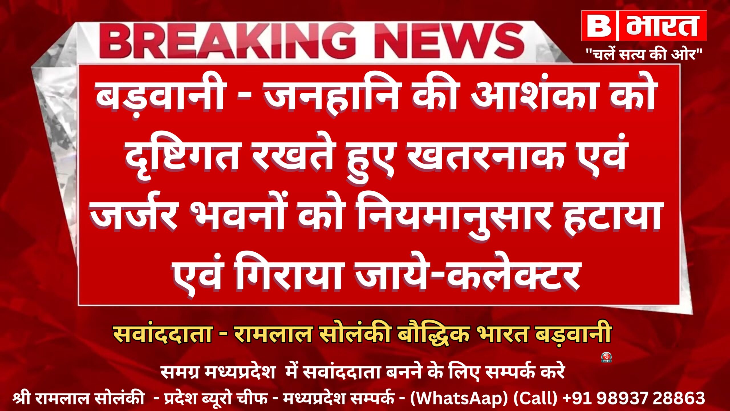 बड़वानी 08 अगस्त 2024/कलेक्टर डॉ. राहुल फटिंग ने जिला पंचायत सीईओ एवं जिले के समस्त एसडीएम, नगरीय निकाय के सीएमओ, तहसीलदार, जनपद पंचायतों के सीईओं एवं समस्त ग्राम पंचायतों के सचिवों को पत्र जारी कर निर्देशित किया है कि जनहानि की आशंका को दृष्टिगत रखते हुए वे अपने क्षेत्र में स्थित जर्जर, जीर्णशीर्ण और खतरनाक भवनो, दीवारों, बाउण्ड्रीवाल आदि संरचनाओं का सर्वे करवाकर उन्हे सर्वोच्च प्राथमिकता पर नियमानुसार हटवाकर एवं गिरवाकर जनहानि की आशंका को शून्य करना सुनिश्चित करे। साथ ही आम जनता से अगर जर्जर एवं खतरनाक भवनो, दीवारो, बाउण्ड्रीवाल के संबंध में कोई शिकायत या जानकारी प्राप्त होती है तो उस पर भी त्वरित कार्यवाही की जाये।