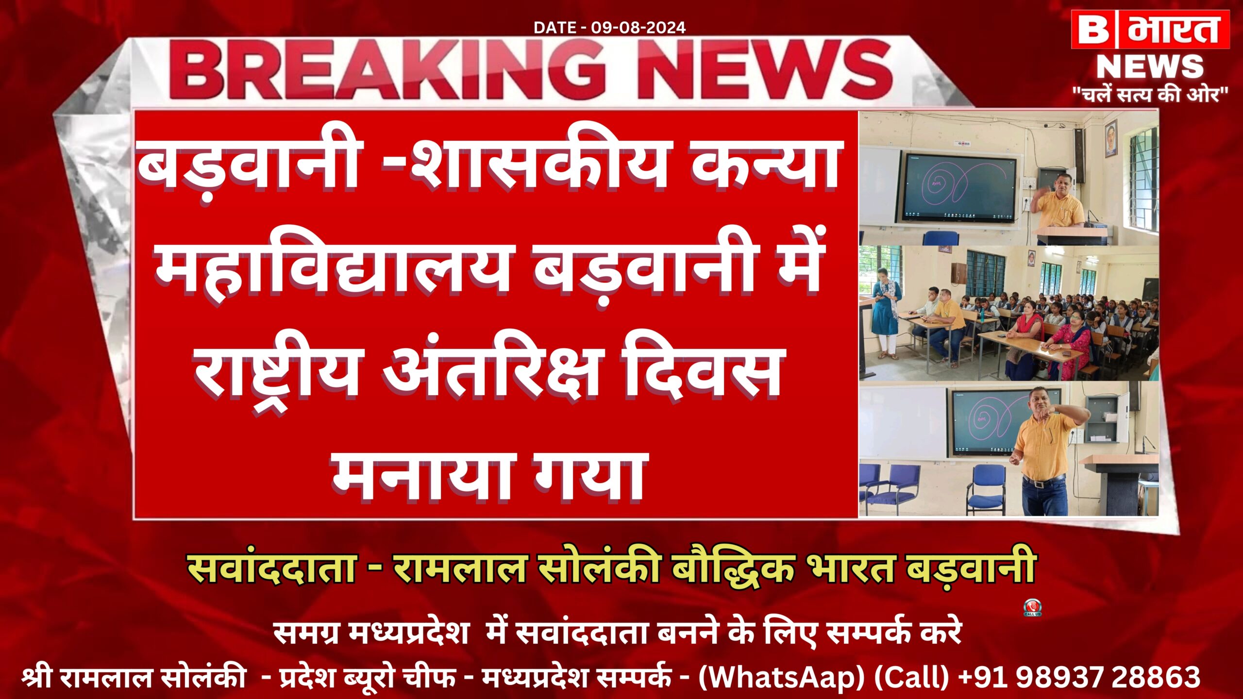 शासकीय कन्या महाविद्यालय बड़वानी में दिनांक 23/08/ 2024 को मध्य प्रदेश शासन उच्च शिक्षा विभाग एवं मध्य प्रदेश विज्ञान एवं प्रौद्योगिकी परिषद के आदेशानुसार तथा प्रभारी प्राचार्य डॉक्टर एन एल गुप्ता एवं नोडल अधिकारी डॉक्टर रविंद्र बर्डे के मार्गदर्शन में महाविद्यालय के लोअर हाल में राष्ट्रीय अंतरिक्ष दिवस 2024 को मनाया गया। आज ही के दिन 23.8.2023 को चंद्रमा रोवन के परियोजना के चंद्रायन-3 की सफलता के ऐतिहासिक क्षण की स्मृति में सरकार ने राष्ट्रीय अंतरिक्ष दिवस की घोषणा की है। इस अवसर पर महाविद्यालय में राष्ट्रीय वेबीनार के मुख्य वक्ता इसरो के वैज्ञानिक श्री नीरज सत्या का व्याख्यान ऑनलाइन प्लेटफॉर्म के माध्यम से स्मार्ट बोर्ड स्क्रीन पर दिखाया गया । श्री सत्या ने चंद्रायन-3 के बारे में विस्तृत रूप से जानकारी दी। प्रभारी प्राचार्य डॉक्टर एन एल गुप्ता ने कहा कि हम हमारे देश के वैज्ञानिकों पर गर्व महसूस करते हैं जिन्होंने चंद्रमा की सतह के दक्षिणी ध्रुव पर दुनिया में सबसे पहले अंतरिक्ष यान को सुरक्षित उतारा । यह हमारे लिए बहुत बड़ी उपलब्धि है । इस अवसर पर डॉक्टर कविता भदोरिया ने विद्यार्थियों को संबोधित करते हुए कहा कि देश के नौजवान वैज्ञानिकों ने देश का गौरव बढ़ाया है डॉक्टर स्नेह लता मुजाल्दा ने मून टच लाइफ टच थीम की जानकारी दी। डॉक्टर दिनेश सोलंकी ने बताया कि अंतरिक्ष से ब्रह्मांड है जिसमें हम रहते हैं वह पृथ्वी है । इस कार्यक्रम के नोडल अधिकारी डॉ रविंद्र बरड़े ने खगोल तारामंडल का ब्रह्णण विज्ञान ,प्राकृतिक विज्ञान और तारों के साथ पूरे अंतरिक्ष की जानकारी दी एवं उन पर विस्तृत प्रकाश डाला। तारामंडल के प्रबंधन द्वारा विद्यार्थियों को भारतीय अंतरिक्ष विज्ञान की विकास यात्रा की विस्तार से जानकारी दी। कार्यक्रम का संचालन डॉक्टर रविंद्र बर्डे ने किया तथा आभार डॉक्टर प्रियंका देवड़ा ने माना, इस अवसर पर वरिष्ठ प्राध्यापक डॉक्टर एन,एल गुप्ता, डॉ रविंद्र बरडे, डॉक्टर कविता भदोरिया ,डॉक्टर स्नेह लता मुजाल्दा ,डॉ मनोज वानखेड़े, डॉ महेश कुमार निंगवाल ,डॉ दिनेश सोलंकी, डॉक्टर प्रियंका देवड़ा ,डॉक्टर इंदु डावर, डॉ॰ विक्रम सिंह भिड़े, डॉक्टर शोभाराम वास्केल, डॉ सुनीता भायल, प्रोफेसर सीमा नाईक, डॉ पदम आर्य , कृष्णा यादव, अरशद खान एवं समस्त छात्रों सहित महाविद्यालय का संपूर्ण स्टाफ उपस्थित रहा।
