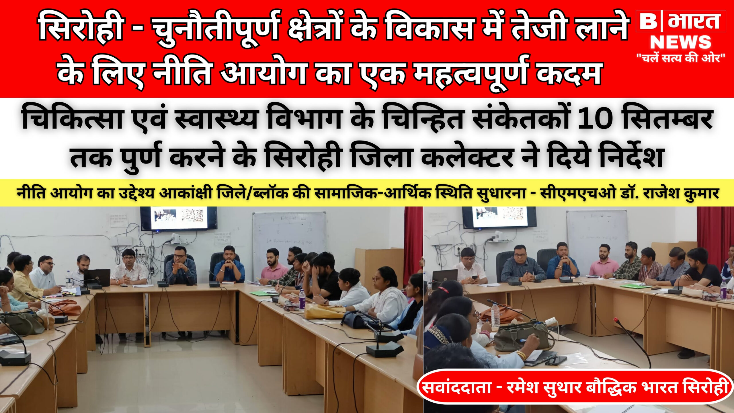 संपूर्णता अभियान के चिकित्सा एवं स्वास्थ्य विभाग के चिन्हित संकेतक- सीएमएचओ डॉ. राजेश कुमार ने बताया कि नीति आयोग के ‘सम्पूर्णता अभियान’ सिरोही जिले में 1 जुलाई, 2024 से चल रहा है। संपूर्णता अभियान के तहत जिले में चिकित्सा एवं स्वास्थ्य विभाग के चार चिन्हित संकेतकों पर ध्यान केंद्रित कर काम करेगा। आकांक्षी जिले में 1. पहली त्रैमासिक अवधि के दौरान प्रसवपूर्व देखभाल (एएनसी) के लिए पंजीकृत गर्भवती महिलाओं का शत प्रतिशत। 2. टीकाकरण पूर्णतः प्रतिरक्षित बच्चों का प्रतिशत (9-11 माह (बीसीजी+डीपीटी3+ओपीवी3+खसरा 1) की शत प्रतिशत उपलब्धि हासिल करना है। 3. ब्लॉक में लक्षित जनसंख्या के मुकाबले मधुमेह की जांच कराने वाले व्यक्तियों का शत प्रतिशत। 4. ब्लॉक में लक्षित जनसंख्या के मुकाबले उच्च रक्तचाप के लिए जांचे गए व्यक्तियों का शत प्रतिशत।