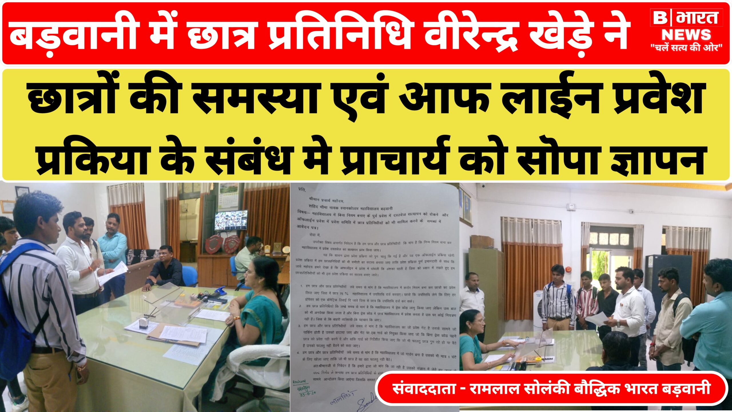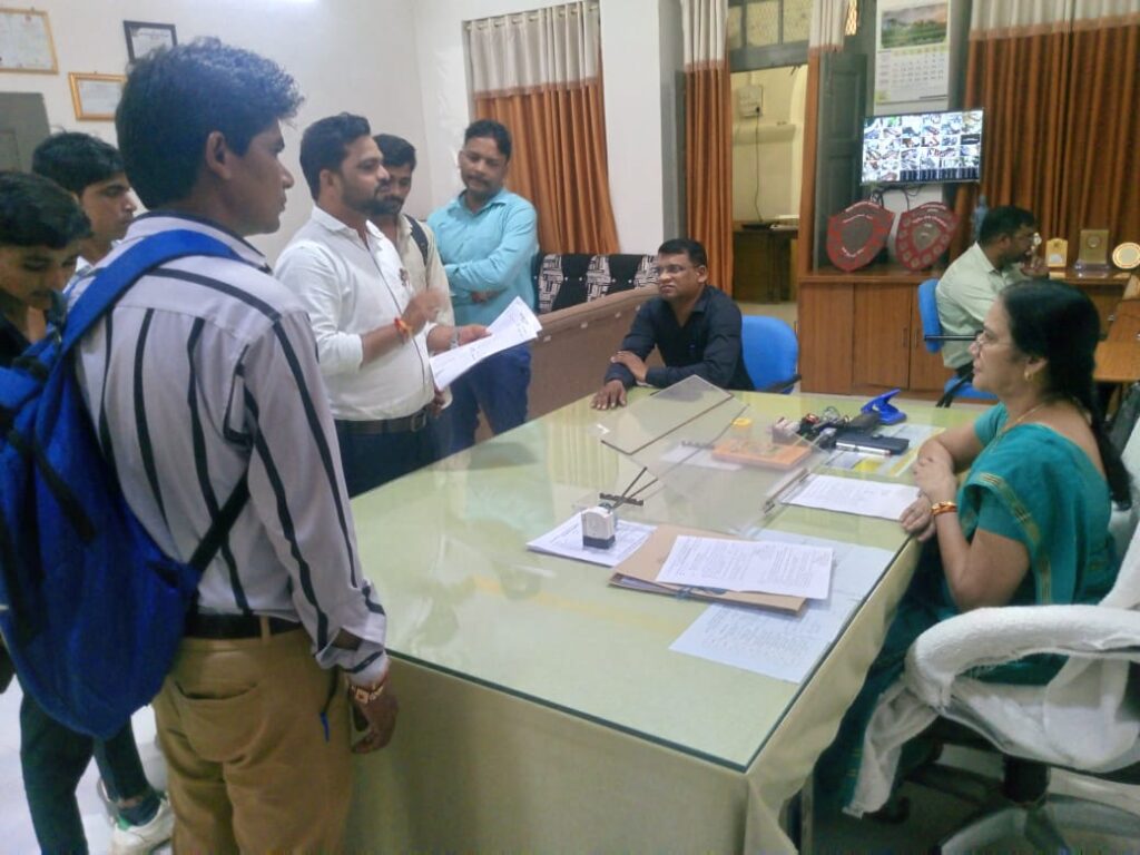 छात्र प्रतिनिधि वीरेन्द्र खेड़े ने छात्रों की समस्या एवं आफ लाईन प्रवेश प्रकिया के संबंध मे प्राचार्य को सॊपा ज्ञापन