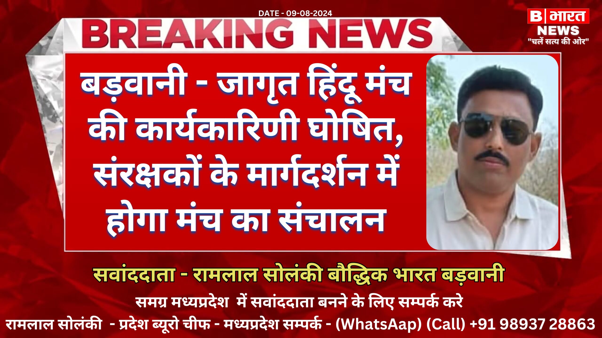 बडवानी :- हिंदू समाज की एकता को बढ़ावा देने एवम हिंदू समाज के समक्ष विद्यमान अंतराष्ट्रीय, राष्ट्रीय एवम स्थानीय चुनौतियों का अध्ययन कर समाधान हेतु कार्यक्रम, बैठक, संगोष्ठियों का आयोजन करने हेतु जागृत हिंदू मंच का गठन किया गया, मंच की गतिविधियों को मूर्त रूप देने के लिए संरक्षकों सहित कार्यकारिणी का गठन सामूहिक विचार-विमर्श पश्चात सर्वसम्मति से किया गया। जागृत हिंदू मंच के अध्यक्ष कृष्णा गोले, उपाध्यक्ष आदित्य शर्मा, राम गुप्ता साखी, ईश्वर यादव पार्षद, विजय कलोसिया, सचिन शर्मा पार्षद, आनंद सोनी डांसर, श्रीमती विजय लक्ष्मी यादव एवम श्रीमती अजीत कोर सलूजा, महामंत्री दीपक जैमन, आनंद हल्दीवाल, श्रीमती संगीता लोह, मंत्री विक्की खरबंदा, सुश्री संगीता जोशी, रवि गांधी, शिवेंद्र निगम टिंगा, अविनाश कलोसिया,व्मूकेश बड़के, हेमंत सोनाने, दुर्गा कुरील कोषाध्यक्ष सुनील गुप्ता, मीडिया प्रभारी अमन शुक्ला, ध्रुव कुमरावत सोशल मीडिया प्रभारी अभीउदय शर्मा, प्रचार मंत्री सुश्री श्वेता भावसार चयनित किए गए, सक्रिय सदस्यों में राधेश्याम भायल, शुभम पांडेय, धर्मेंद्र चौहान पानू, भगवती सोनी एवम विपिन गुप्ता रहेंगे।