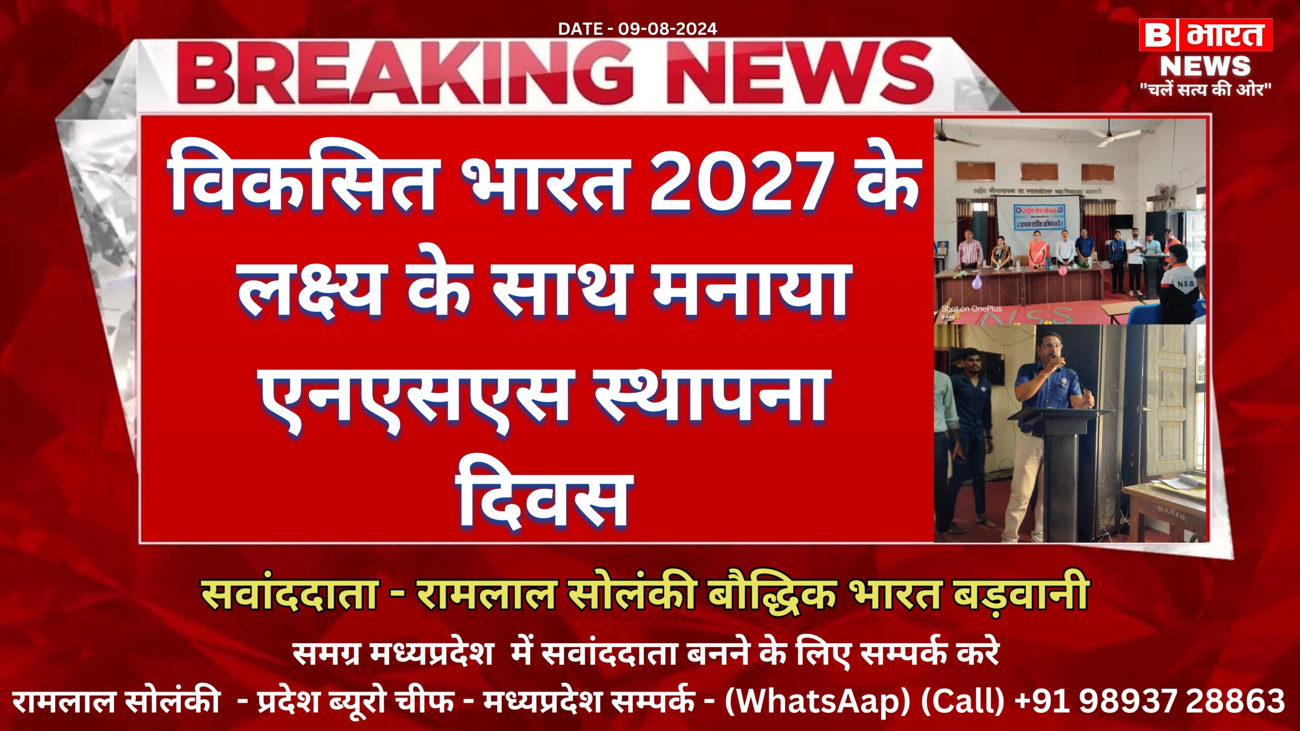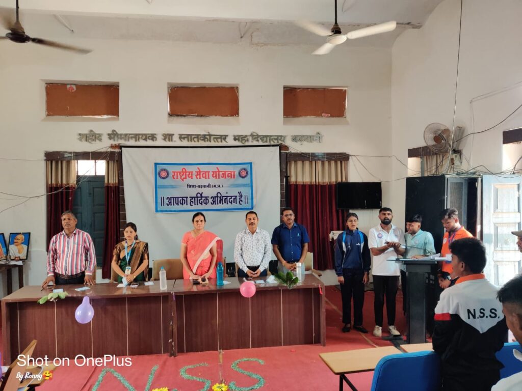राष्ट्रीय सेवा योजना, का स्थापना 55वा दिवस प्रधानमंत्री कॉलेज ऑफ एक्सीलेंस शहीद भीमा नायक पीजी कॉलेज बड़वानी में मनाया गया इस अवसर पर मुख्य वक्ता के रूप के कॉलेज की प्राचार्य डॉ वीणा सत्य ने स्वयंसेवको को संबोधित करते हुए कहा कि शिक्षा के साथ समाज सेवा और व्यक्तित्व विकास होना चाहिए,विकसित भारत की संकल्पना को साकार करने की दिशा में नई शिक्षा नीति 2020 के अनुसार के साथ आत्मनिर्भर बनने की दिशा में हमारे कदम ताल होना चाहिए, रासेयो की अवधारणा के अनुरूप विद्यार्थियों में व्यक्तित्व विकास हो ताकि समाज सेवा और राष्ट्र सेवा का लक्ष्य पूरा हो सकें।साथ ही प्राचार्य ने आयुष्मान भारत की शपथ दिलाई। कार्यक्रम में जिला संगठक डॉ आरएस मुजाल्दा ने विश्वविद्यालय के अनुरूप पूरे जिलेभर में 37 इकाई संचालित की जा रही है भीमा नायक कॉलेज बड़वानी की इकाईयों के कार्य सबसे उत्कृष्ट कार्य कर रही है, यहाँ के महेश कनासे ने इंदिरा गांधी राष्ट्रीय पुरस्कार प्राप्त किया है, अंतिम मंडलोई भूषण पाटिल, दिवान भुगवाड़े ने भी राष्ट्रीय पुरस्कार प्राप्त किया और कई विद्यार्थी राष्ट्रीय व राज्य स्तर पर बड़वानी व कॉलेज का नेतृत्व किया ही, ओर प्रदेश का रोल मॉडल के रूप में अपनी छबी बरकार है, साथ ही मुजाल्दा ने कहा कि पंजीयन का कार्य पूरा करे और साथ ही शासन के दिशा निर्देश अनुसार हमे लक्ष्य प्राप्ति करना होंगे, जिला संघटक के द्वारा एनएसएस बी 100 एवं आठ सी प्रमाण पत्र वितरित किये गए। कार्यक्रम अधिकारी डॉ राजमलसिंह राव ने संबोधन में कहा समय व दिनचर्या पालन किया जाय, में नही तुम, का व्यवहार होना जरूरी, एनएसएस के प्रेरणा पुरूष स्वामी विवेकानंद जी के पद चिन्हों पर चलना हमारा कर्तव्य है। डॉ स्वेता कटियार पूर्व कार्यक्रम अधिकारी ने भी विचार रखे और कहा कि हमने छात्राओं की प्लाटून तैयार की रासेयो की प्लाटून द्वारा उन्हें उपहार भेंट किया, छात्रा इकाई की कार्यक्रम अधिकारी डॉ रंजना चौहान ने अपने सम्बोधन में कहा कि छात्राओं भी आज रासेयो में ततपरता के साथ भाग ले रही हैऔर प्लाटून में राष्ट्रीय पर्व पर एनसीसी ओर पुलिस के साथ कदमताल मिलाकर शांति का संदेश दे रही है, वरिष्ठ स्वयंसेवको गंगाराम जाधव, हरीश चौहान, मांगीलाल पावर, यश करोले, गणेश कुशवाह, अजय चौहान, अजय पाटीदार, करम सिंह, आस्था भवेल, शिवानी मंडलोई, रवीना खरते, ने अपने अनुभव सुनाए ओर स्वीकार किया कि उन्हें पहले मंच पर नही बोल सकते अब बिना रुके बेझिझक बोलते है, जिसकी प्राचार्य ओर जिला संगठक ने प्रसंशा की ओर कहा कि रासेयो से विद्यार्थियों के व्यक्तित्व का विकास हुआ है, कार्यक्रम का संचालन कर कार्यक्रम अधिकारी डॉ रणजीत सिंह मेवाडें ने कहा कि राष्ट्रीय सेवा योजना की स्थापना 1969 में 