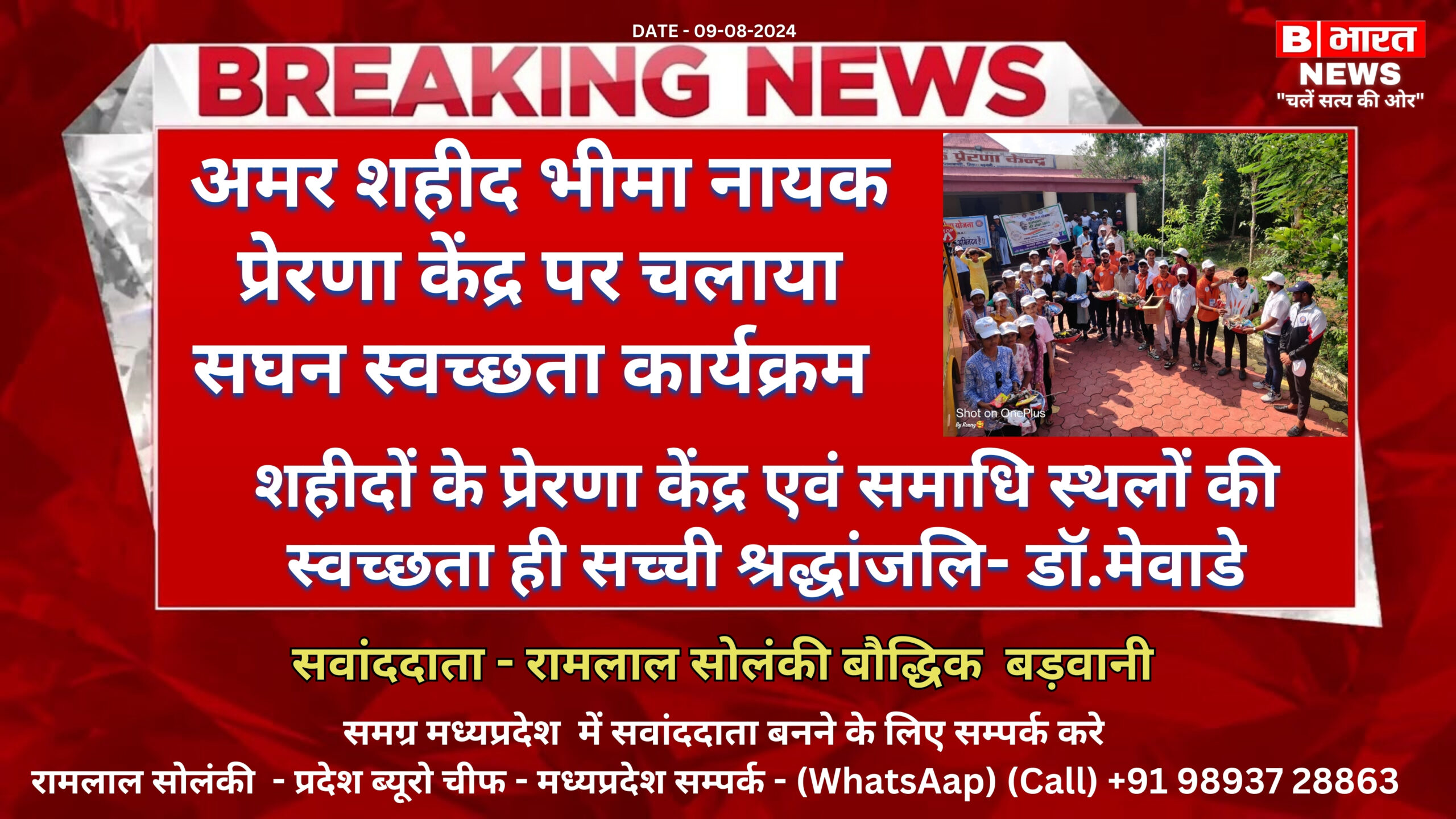 प्रधानमंत्री कॉलेज आफ एक्सीलेंस शहीद भीमा नायक शास. स्नातकोत्तर महाविद्यालय बड़वानी के स्वयंसेवकों के द्वारा चलाया गया संघन स्वच्छता कार्यक्रम जिसके तहत कार्यक्रम अधिकारी डॉ. रणजीत सिंह मेवाड़ डॉ. रंजना चौहान डॉ राजमल सिंह राव के मार्गदर्शन में उक्त प्रेरणा केंद्र पर सघन स्वच्छता कार्यक्रम चलाया गया । जिसके तहत लगभग 120 विद्यार्थियों की उपस्थिति में पूरे प्रेरणा केंद्र के आसपास फैली हुई प्लास्टिक को इकट्ठा किया गया आस, पास उगी हुई, गाजर घास को उखाड़कर प्रेरणा केंद्र को साफ स्वच्छ किया गया । निमाड़ के प्रथम स्वतंत्रता सेनानी शहीद भीमा नायक के प्रेरणा केंद्र पर स्वच्छता पखवाड़ा कार्यक्रम चलाया गया साफ सफाई करके सभी स्वयंसेवकों ने शहीद भीमा नायक को सच्ची श्रद्धांजलि अर्पित की । डॉ.मेवाडे ने कहा जिस स्वतंत्रता सेनानी ने हमें आजादी दिलवाले के लिए अपने प्राणों की आहुति दे दी उनके प्रेरणा केंद्र और समाधि स्थल पर वर्ष भर इस प्रकार के स्वच्छता कार्यक्रम चलाए जाने चाहिए । ताकि उन्हें सच्चे श्रद्धांजलि अर्पित की जा सके। कार्यक्रम अधिकारी डॉ.रंजना चौहान ने कहा शहीद भीमा नायक के बलिदान से हमें प्रेरणा लेना चाहिए निस्वार्थ भाव से सेवा करना चाहिए व हमारे जीवन में इसे अमल करना चाहिए। डॉ. राजमल सिंह राव अपने सभी विद्यार्थियों को संबोधित करते हुए ,कहा की प्रत्येक स्वतंत्रता सेनानियों के समाधि स्थल पर समग्र स्वच्छता कार्यक्रम चलाया जाना चाहिए । उक्त स्वच्छता पखवाड़ा कार्यक्रम में एन.एस.एस के स्वयंसेवक गंगाराम जाधव हरीश चौहान उर्मिला चौहान अंकित चौहान सपना सस्तिया, राकेश तोमर मनोज भिलावे, अनुज गंगवाल हिमांशु चौहान ,रोहित भायल दिलीप मोरे, सुमित आवास्या ,राहुल चौहान, रोहित चौहान, तमन्ना ,जेसिका ,नंदनी वैदेही,निलेश,नामदेव आकाश, विकास, आशीष,अनिल रितेश महेंद्र आदि स्वयंसेवक उक्त कार्यक्रम में उपस्थित थे।