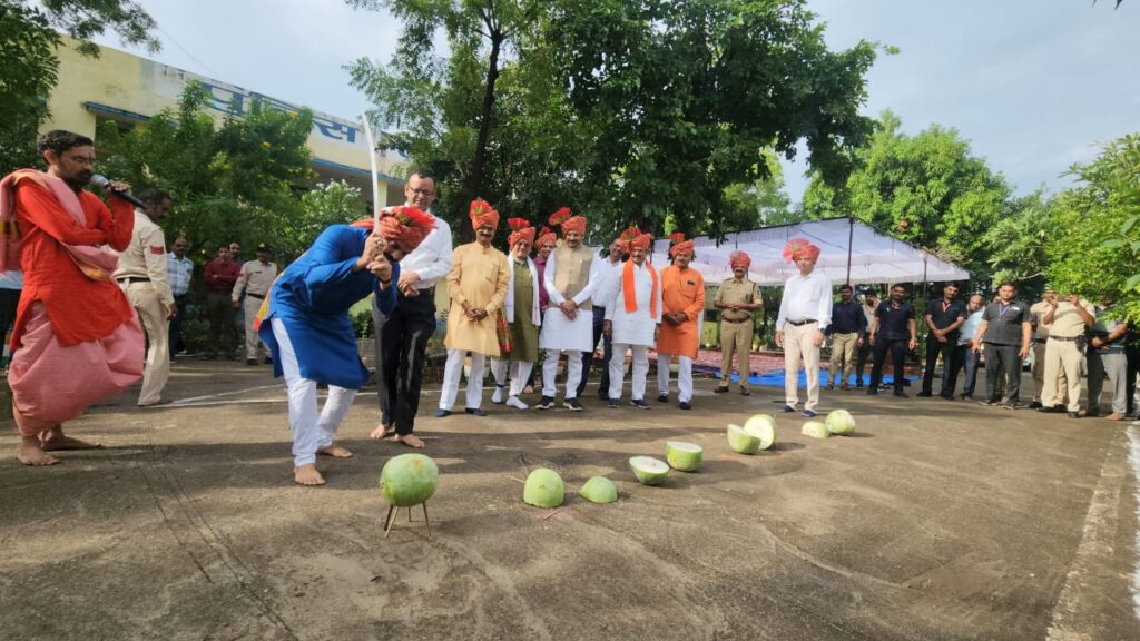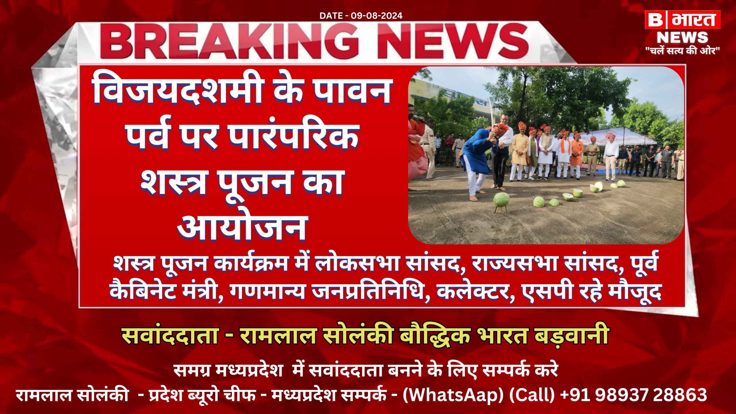 आज दिनांक 12.10.2024 शनिवार को पुलिस अधीक्षक, बड़वानी श्री पुनीत गेहलोद द्वारा विजयदशमी के पावन पर्व पर पारंपरिक शस्त्र पूजन का आयोजन जिला पुलिस लाइन, बड़वानी में किया गया। इस अवसर पर लोकसभा सांसद श्री गजेंद्र सिंह पटेल, राज्यसभा सांसद श्री सुमेर सिंह सोलंकी, पूर्व कैबिनेट मंत्री श्री प्रेम सिंह पटेल, कलेक्टर डॉ. राहुल फटिंग, अतिरिक्त पुलिस अधीक्षक श्री अनिल कुमार पाटीदार सहित अन्य गणमान्य जनप्रतिनिधि उपस्थित थे। शस्त्र पूजन विधि-विधान पूर्वक संपन्न हुआ, जिसमें विश्व शांति और संकट निवारण के लिए हवन कुंड में आहुतियां डाली गईं और वाहनों का पूजन किया गया। दशहरा का यह पर्व नैतिकता और मूल्यों के साथ सत्य की विजय का प्रतीक है। शस्त्र पूजन के पश्चात गार्ड द्वारा हर्ष फायर किया गया और अन्य रस्मों का परम्परा अनुसार आयोजन किया गया। आतिशबाजी के साथ इस पावन पर्व की गरिमा को और अधिक बढ़ाया गया। इस अवसर पर सभी समाज वर्ग के लोग एकजुट होकर विश्व कल्याण के कार्यों में संलग्न रहे और विजयदशमी पर्व की शुभकामनाएं दीं।कार्यक्रम में एसडीओपी बड़वानी श्री दिनेश चौहान, डीएसपी महिला सुरक्षा श्री महेश सुनैया, डीएसपी अजाक श्री जितेंद्र भास्कर, रक्षित निरीक्षक श्री चेतन बघेल और पुलिस अधीक्षक कार्यालय, रेडियो शाखा, यातायात, एजेके, महिला सेल एवं पुलिस लाइन के अन्य अधिकारी और कर्मचारीगण उपस्थित थे।