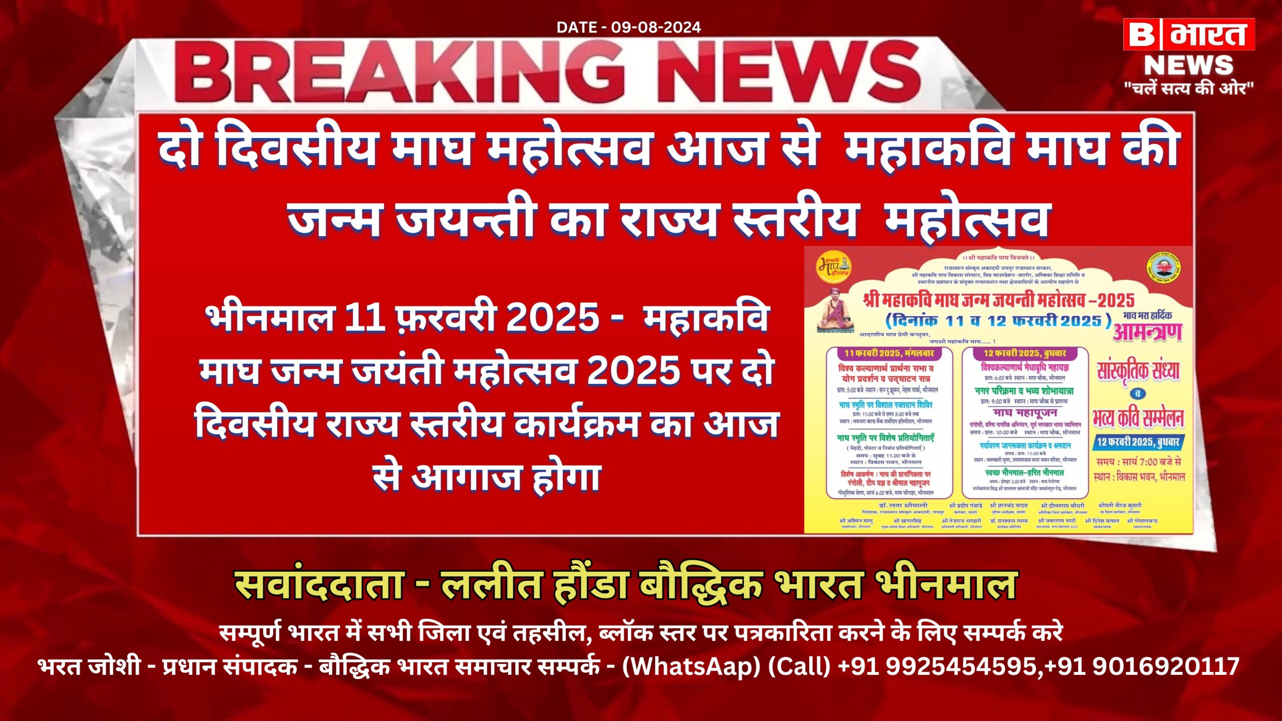 भीनमाल 11 फ़रवरी 2025 – महाकवि माघ जन्म जयंती महोत्सव 2025 पर दो दिवसीय राज्य स्तरीय कार्यक्रम का आज से आगाज होगा