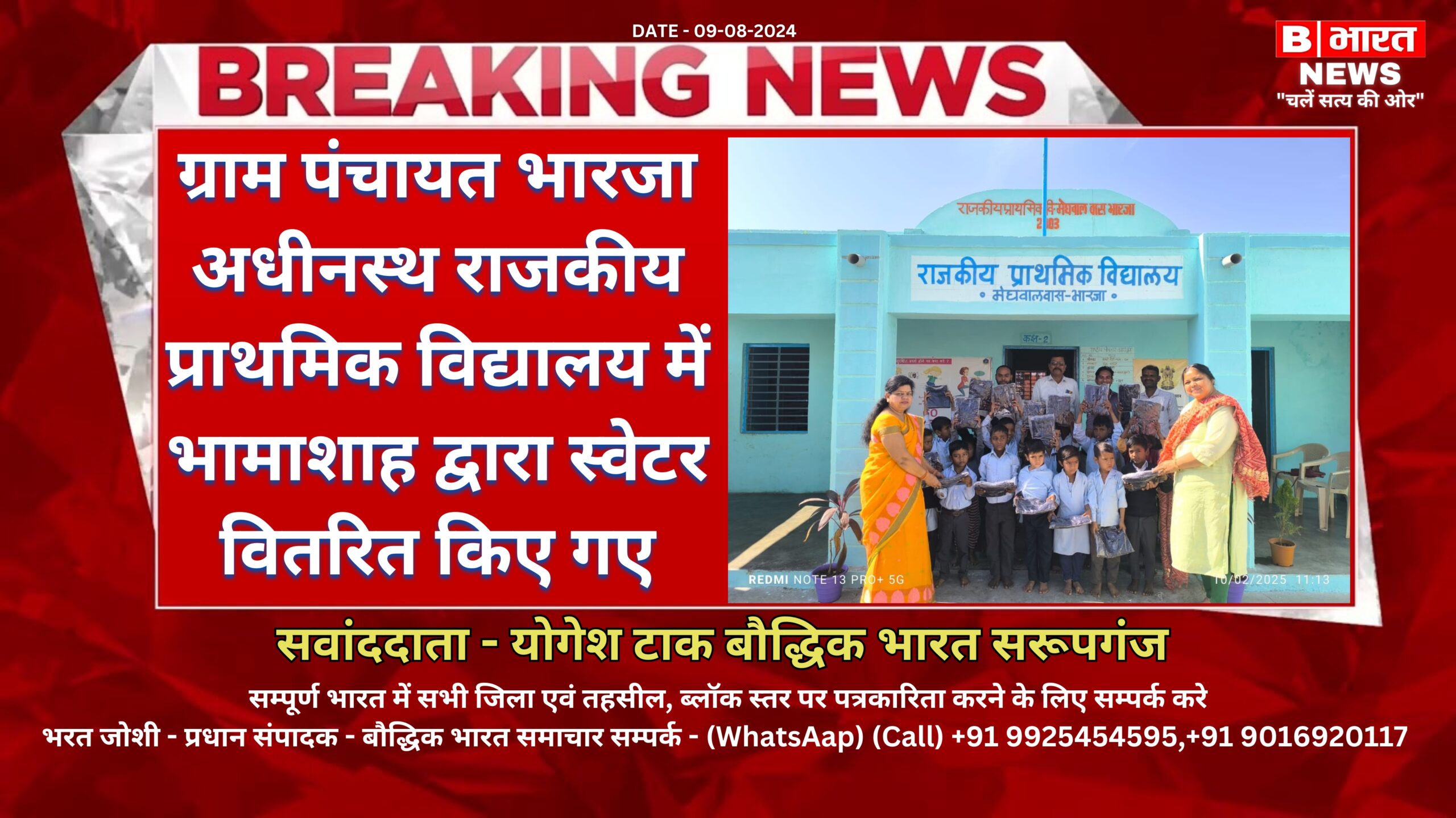 प्रधानाध्यापक भावेश परिहार के अनुसार विद्यालय में छात्र ठंड में ठिठुरते थे जिस पर राजकीय बालिका उच्च माध्यमिक विद्यालय की प्रधानाचार्य वंदना अग्रवाल से बात की। प्रधानाचार्य वंदना अग्रवाल की प्रेरणा से आर्ट ऑफ लिविंग की जिला कोऑर्डिनेटर संगीता अग्रवाल ने विद्यालय में अध्ययनरत सभी 26 विद्यार्थियों को स्वेटर वितरित किए । इस पर प्रधानाध्यापक ने प्रेरक वंदना अग्रवाल व भामाशाह संगीता अग्रवाल का आभार जताया। इस दौरान कार्यवाहक पीईईओ पूर्णिमा परिहार, राजकीय बालिका उच्च माध्यमिक विद्यालय की प्रधानाचार्य वंदना अग्रवाल, रविंद्र परिहार, एसएमसी उपाध्यक्ष मांगीलाल परिहार, संजय कुमार, कैलाश डांगी सहित ग्रामीण व स्टाफ उपस्थित रहे।