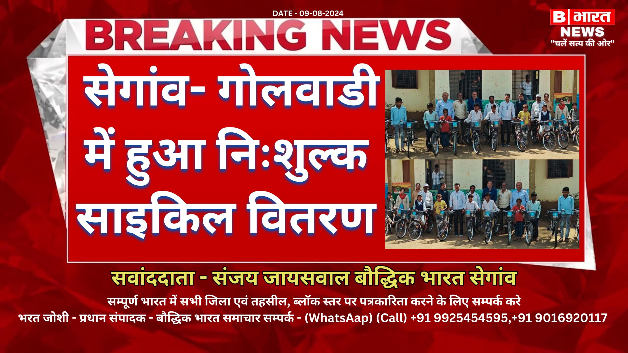 सेगांव-एकीकृत शासकीय हाई स्कूल गोलवाड़ी में निशुल्क साइकिल वितरण वर्ष मे 2023-24 एवं 2024 -25 जन प्रतिनिधियो के द्वारा निशुल्क साइकिल वितरण किया गया । इस अवसर पर जनपद उपाध्यक्ष व शिक्षा समिति अध्यक्ष ओमप्रका पाटीदार एवं सरपंच प्रतिनिधि मुकेश मंडलोई भाजपा किसान मोर्चा जिला मंत्री कृष्णकांत यादव भाजपा मंडल अध्यक्ष अश्विन ठाकुर ओमप्रकाश प्रजापत एवं एकीकृत हाई स्कूल गोलवाड़ी संकुल प्रभारी दिनेश पटेल व प्रधान पाठक बंसीलाल भँवर व स्टाफ के समस्त शिक्षक गण उपस्थित थे।