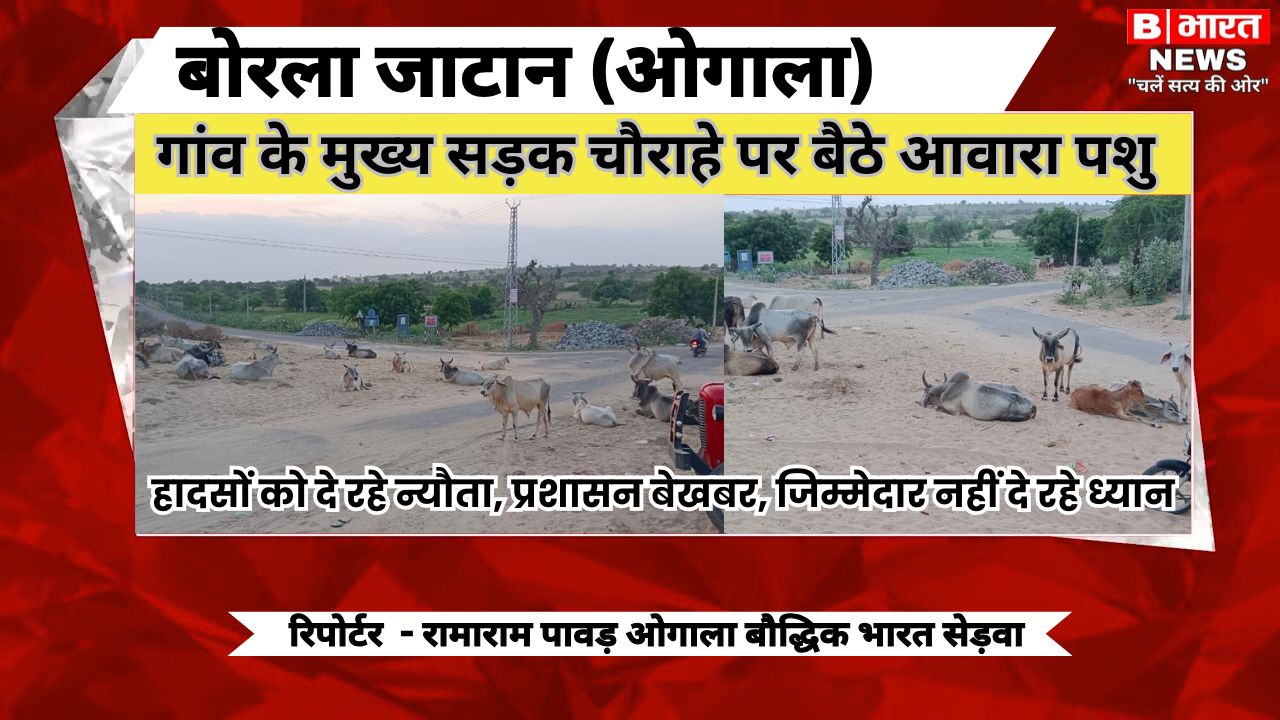 बोरला जाटान (ओगाला) – गांव के मुख्य सड़क चौराहे पर या आम रास्तों पर आवारा मवेशियों का जमावड़ा लगा रहने से वाहन चालकों सहित राहगीरों को परेशानी का सामना करना पड़ रहा है। इससे कभी भी दुर्घटनाएं घट सकती हैं। गांव में मुख्य सड़क आकल फांटा चौराहा, बोरला नाडी रोड़ चौराहा, सोनाराम रेबारी का थान स्कूल रोड़ चौराहा, ग्राम ओगाला रोड सहित सभी मुख्य चौराहों पर आवारा मवेशियों का जमावड़ा लगा रहता है। यह मुख्य सड़क (धोरीमन्ना से साता और उपखंड सेड़वा से वाया आकल, बोरला जाटान, वाया सोमारड़ी, कोट तिलांन ,सांचौर ) के बोरला जाटान चौराहे पर रात के समय मवेशी सडक पर बीच में ही बैठे रहते हैं। इससे दुर्घटनाए घट सकती हैं। ग्राम वासियों का कहना है कि प्रशासन को सार्वजनिक रूप से मुनादी करवाकर मवेशी मालिकों को चेतावनी देनी चाहिए, लेकिन अभी तक किसी ने ध्यान नहीं दिया। आवारा मवेशी सड़क पर गदंगी फैला देते हैं और रात के समय दुकानों के बाहर बैठे रहते हैं। ग्रामवासियों ने ग्राम प्रशासन से इन पर पाबंदी लगाने ने की मांग की है। सार्वजनिक रूप से घोषणा पत्र जारी कर मवेशी पशुपालकों को सूचित करे कि कोई भी सांड, बैल, गोमाता को निराश्रित नहीं छोड़े, सेवा नहीं हो रही है तो नजदीकी गोशाला में भेजे।