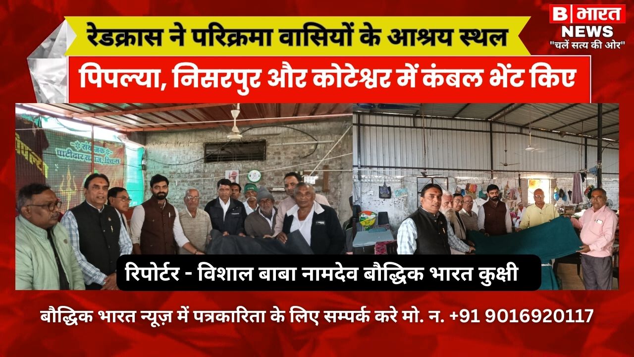कुक्षी :- कड़कड़ाती ठंड और खुले मे सोने वाले नर्मदा परिक्रमा वासियों को दिनभर की थकान से राहत और बचाव के पुण्यार्थ का काम करने वाले नर्मदा परिक्रमा वासी विश्राम गृह, आश्रम के संचालकों को रेडक्रास सोसायटी ने कंबल भेंट किए। कलेक्टर एवं जिला रेडक्रॉस सोसायटी के अध्यक्ष प्रियंक मिश्र के निर्देशानुसार कुक्षी अनुविभागीय रेडक्रॉस सोसायटी के अध्यक्ष एवं आईएएस एसडीएम विशाल धाकड़ ने पदाधिकारी एवं सदस्यों के साथ कंबल वितरित किये । ग्राम पिपलिया में खंडवा बड़ौदा हाइवे स्थित मां नर्मदा परिक्रमा वासी आश्रम में कंबल सौंपे गए इस अवसर पर आश्रम के जगदीश सागरिया, देवराम सटवा, जगदीश राजाजी, अंकित जैन, सचिन राजा जी, आदिराम सटवा, रमणलाल सटवा उपस्थित रहे, निसरपुर पुनर्बसाहट स्थल पर हनुमान मंदिर स्थित मां नर्मदा परिक्रमा वासियों के लिए बने आश्रम पर भी कंबल भेंट किए गए इस अवसर पर आश्रम के संचालक गण एवं समाजसेवी तुलसीराम मण्डवाडिया, संजय पकावदीया, गंगाराम कामदार, भुतीया भाई, गंगाराम भोलु आदि शामिल थे। नर्मदा घाट कोटेश्वर स्थित सन् 1991 से जारी अखंड रामधुन स्थल एवं नर्मदा परिक्रमा वासियों का आश्रय स्थल ब्रह्मलोक वासी संत दगड़ू जी महाराज आश्रम में भी कंबल प्रदान किए गए। यहां संचालक मंडल के रमेश भाई पिराग जी पाटीदार, श्री सुनील सोनी सहित आश्रम के सदस्य गण एवं परिक्रमा वासी आदि थे।इस अवसर पर रेड क्रॉस सोसाइटी के सदस्य एवं नायब तहसीलदार पंकज यादव, रेडक्रॉस सोसायटी के उपाध्यक्ष बंशीलाल बाडमेरा,डॉ. निर्मल कुमार पाटीदार, पं. मनोहर मण्डलोई, आशुतोष सेन आदि शामिल रहे।