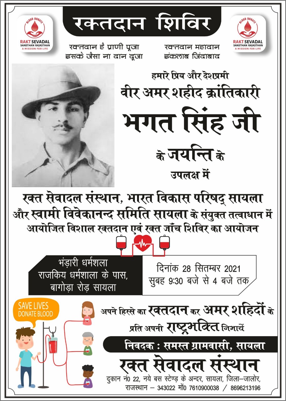 शहर के भंडारी धर्मशाला में रक्तसेवादल संस्थान,भारत विकास परिषद् एवम् विवेकानंद समिति के संयुक्त तत्वाधान में 28 सितम्बर2021, मंगलवार को अमर क्रांतिकारी शहीद भगत सिंह के जन्मदिन के अवसर पर स्वेच्छिक रक्तदान एवम् जांच शिविर का आयोजन किया जा रहा है। रक्त सेवादल संस्थान के अध्यक्ष विक्रम त्रिवेदी ने बताया कि अमर शहीद भगत सिंह देश के हर युवा के आदर्श है रक्तदान कर सभी युवाओं को अपने कर्तव्य का निर्वहन करना चाहिए।