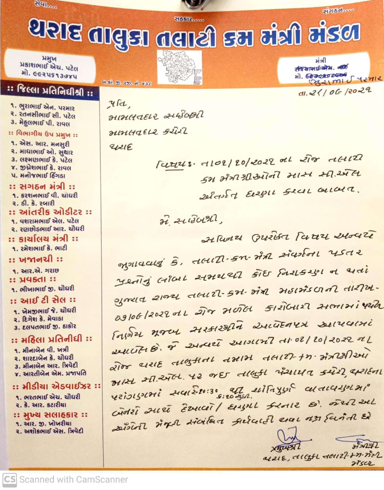 થરાદ તાલુકામાં તલાટી કમ મંત્રી મંડળ દ્વારા ઘણા દિવસ થી તલાટી કમ મંત્રી ની વિવિધ વિષયોની માંગણી માટે સરકાર માં માગ કરવામાં આવેલ છે પરંતુ આજ દિન સુધી તેનું કોઈ પણ પ્રકાર નું નિરાકણ ના આવતા તે અનુસંધાને તારીખ 1/10/2021 ના રોજ તાલુકા કક્ષાએ એક માસ ની સી એલ તથા શાંતિપૂર્વક માંગણી ઓના બેનરો સાથે દેખાવ કરનાર છે તેવું આવેદનપત્ર તલાટી કમ મંત્રી મંડળ દ્વારા મામલતદારને આપવામાં આવ્યું હતું.