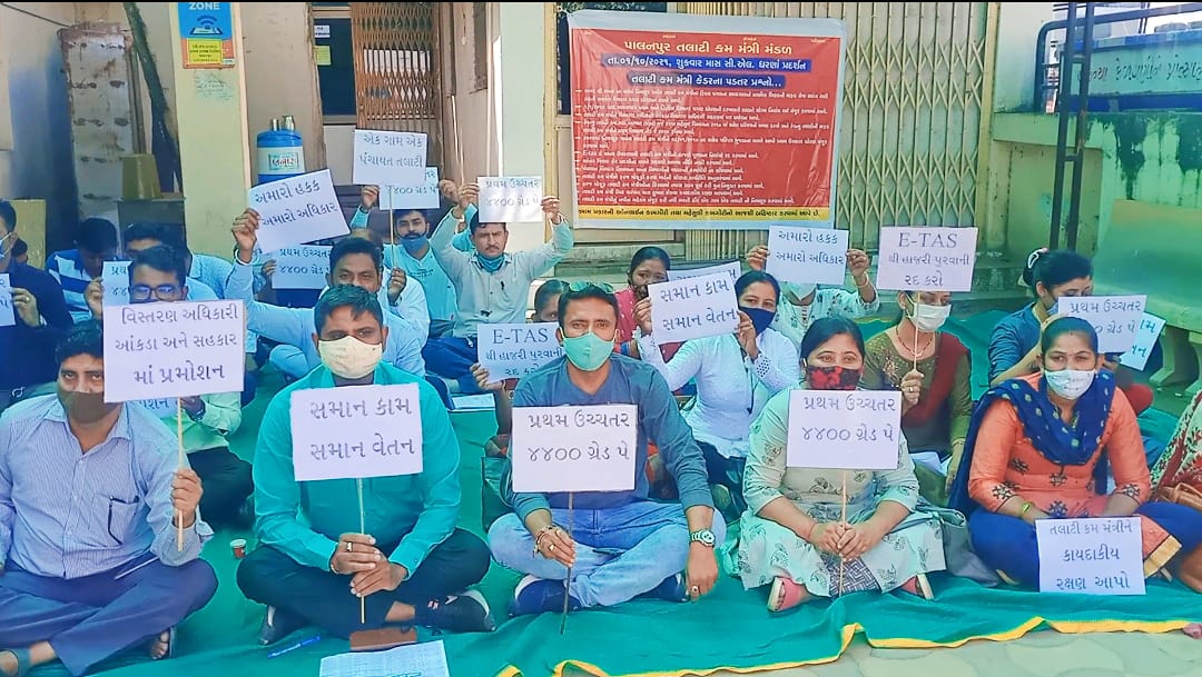 પાલનપુર તાલુકાના છેવાડાના ગામડાઓમાં ફરજ બજાવતા તલાટી કમ મંત્રીઓ પાલનપુર તાલુકા પંચાયત કચેરી ખાતે ઉપસ્થિત રહી તેમની ૧૨ જેટલી પડતર માંગણીઓને લઇને પાલનપુર તાલુકા પંચાયત ખાતે માસ સી.એલ ધરણાં પ્રદર્શન કરવામાં આવ્યું હતું જેમાં કાર્યક્રમમાં સરકાર ની ગાઈડલાઈન નું ફરજિયાત માસ્ક તેમજ સામાજિક અંતર રાખી ધરણા પ્રદર્શન કાર્યક્રમ કરવામાં આવ્યો હતો જેમાં સરકાર સામે 12 જેટલા મુદ્દા રજુ કરી અને આ 12 મુદ્દાઓનું સંપૂર્ણપણે અમલીકરણ થાય તેવો આક્રોશ વ્યક્ત કરવામાં આવ્યો હતો.. ત્યારે તલાટી કમ મંત્રી એસોસિયેશન પ્રમુખ દ્વારા જણાવવામાં આવ્યું હતું કે જો આવનાર સમયમાં આ 12 માંગણીઓ સ્વીકારવામાં નહિ આવે તો ગાંધીનગર ખાતે વિરોધ પ્રદર્શન કરી ગાંધી ચિંધ્યા માર્ગે આંદોલન કરવાની ચીમકી આપી હતી