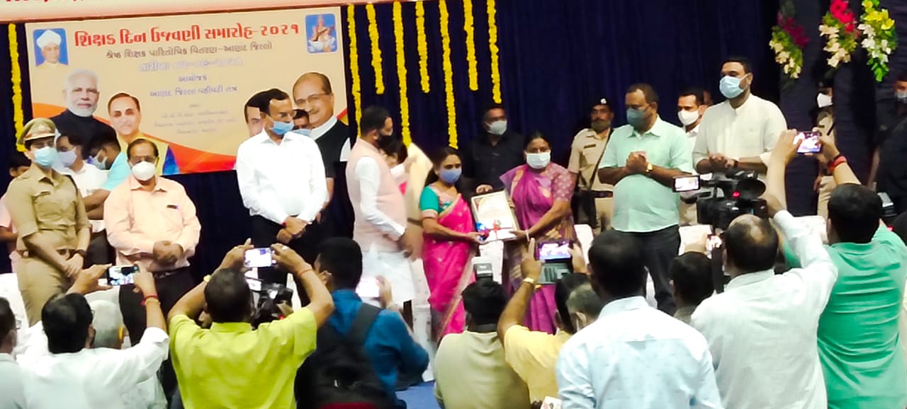 આજ રોજ આણંદ જિલ્લાના શિક્ષણ ક્ષેત્રે ગૌરવરૂપ ગણાય તેવી ઉત્કૃષ્ટ સેવા માટે તાલુકા તેમજ જિલ્લાનાશ્રેષ્ઠ શિક્ષક પારિતોષિત યોજના ૨૦૨૧ અંતર્ગત આણંદ ના શિક્ષક મિત્રો નો સન્માન સમારંભ યોજાયો હતો આ પ્રસંગે શ્રીમતી સંગીતાબેન પરમાર નું સ્વાગત માનનીય શ્રી પ્રદીપસિંહ જાડેજા ગુહઉજાૅ વૈધાનિક અને સંસદીયબાબતો કાયદો અને ન્યાયતંત્ર રાજ્યકક્ષા પોટોકોલ દ્વારા કરવામાં આવ્યુ હતું ઉપસ્થિત મહાનુભાવો જિલ્લા પંચાયત પ્રમુખ શ્રીમતી હંસાબેન પરમાર, શ્રીમાન આદરણીય મિતેશભાઇ પટેલ સાંસદ, આણંદમાનનીય ધારાસભ્ય શ્રી, આણંદ જિલ્લો શિક્ષણ અધિકારી શ્રી, આણંદ, કલેકટર અને જિલ્લા મેજીસ્ટ્રેટ શ્રી,આ પ્રસંગે ઉપસ્થિત રહ્યા હતા શિક્ષક મિત્રોને શુભેચ્છા પાઠવવામાં આવી હતી મુખ્ય મહેમાન તરીકે આદરણીય શ્રી ગૃહ મંત્રી પ્રદીપસિંહ જાડેજા ઉપસ્થિતિ રહી શ્રેષ્ઠ શિક્ષક નો એવોડૅ આપવામાં આવ્યો હતો. એવોર્ડ સ્વિકારતા સંગીતાબેન ની તસ્વીર નજરે ચડે છે. ખુબ ખુબ શુભેચ્છા તથા અભિનંદન ખંભોળજ સાહિત્ય સેવા સંસ્થા રાષ્ટ્રીય અધ્યક્ષશ્રી શૈલેષ વાણીયા ‘શૈલ’ આણંદ ગુજરાત દ્વારા.