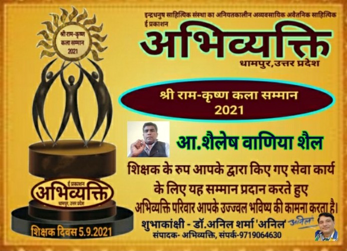 ૫ સપ્ટેમ્બર ૨૦૨૧ ડોક્ટર સર્વપલ્લી રાધાકૃષ્ણનના માનમાં ધામપુર ઉત્તર પ્રદેશ અભિવ્યક્તિ સંસ્થા દ્વારા ગુજરાતમાંથી ખેડા- જિલ્લાના નડિયાદ તાલુકાના વડતાલ ગામમાં મદદનીશ શિક્ષક તરીકે સેવા બજાવતા કવિ શ્રી શૈલેષ વાણીયા શૈલ ને રામ કૃષ્ણ કલા એવોર્ડ થી સન્માનિત કરવામાં આવ્યા કોરોના મહામારી ઓનલાઇન શિક્ષણ દ્વારા બાળકોને પ્રોત્સાહિત કર્યા હતા સેવાને દ્વારા લઈ ઉતર પ્રદેશ ની આ સંસ્થા તેમના ભવિષ્ય માટે ઉત્તરોત્તર પ્રગતિ કરે તે હેતુ સંસ્થા ના અધ્યક્ષડોક્ટર અનિલ શર્મા અનિલદ્વારા ઓનલાઇન પ્રમાણપત્રક આપી સન્માનિત કરવામાં આવ્યા હતા. તેની જાણ થતાં શ્રી સાઈ ફાઉન્ડેશન પુણે મહારાષ્ટ્ર ના અધ્યક્ષ શ્રીસંજય ભાઉં ને થતા તેઓ એ ટેલિફોનિક શુભેચ્છા પાઠવી હતી સાથે કલમથી કલમ સાહિત્ય મંચના અધ્યક્ષ શ્રીમાન સુનીલ સુથાર દ્વારા શુભેચ્છા પાઠવવામાં આવી હતી. સેન્ટ મેરી પેટલાદ, અમદાવાદ જેવી મોટી મોટી શાળાઓની અંદર આચાર્ય પદેથી નિવૃત્ત માજી આચાર્યશ્રી રેવ.ફાધર માટીૅન અપ્પા દ્વારા બહુમુખી પ્રતિભા ધરાવતા શ્રીમાન શૈલેષ વાણીયા શૈલ ને ખુબ ખુબ શુભેચ્છાઓ પાઠવી હતી.