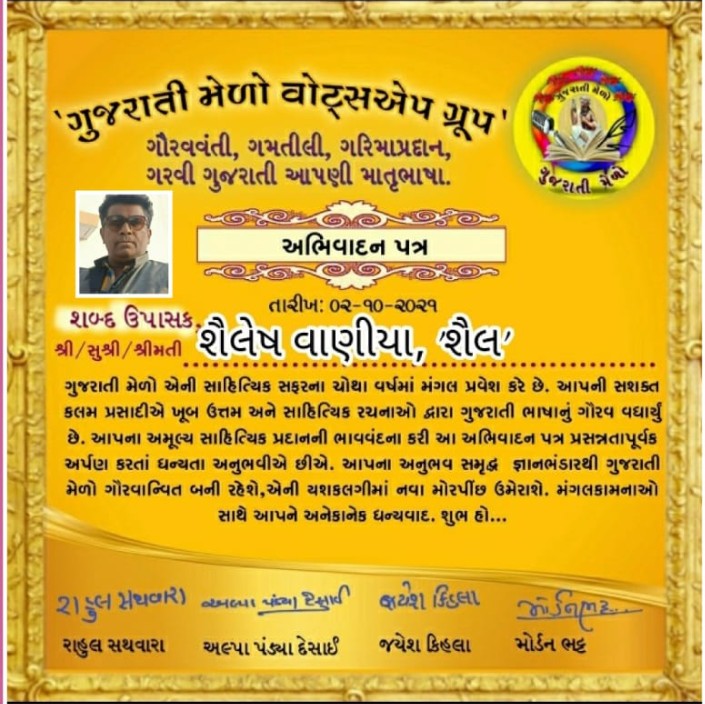 2 ઓક્ટોબર 2021 ના રોજ ત્રણ વર્ષ પૂર્ણ કરી ચોથા વર્ષમાં મંગલ પ્રવેશ કરે છે આ પ્રસંગને યાદગાર બનાવવા માટે ગુજરાતી મેળો દ્વારા 2ઓક્ટોબરના રોજ સ્ટોરી ડે ઉજવણી કરવામાં આવી હતી તેમા ભાગ લેનાર સર્જક મિત્રોનું સન્માન કરવા સમારંભ યોજાયો ગ્રૂપમાં વાર્તાઓ મૂકી જન્મ દિવસ ની અનોખી ઉજવણી કરવામાં આવી તેના પ્રમાણપત્ર આજ રોજ આપવામાં આવ્યા હતા ગુજરાતી મેળો ના એડમીન *શ્રી મોડર્ન ભટ્ટ 9426260947 જી ને ખંભોળજ સાહિત્ય સેવા સંસ્થાના પ્રમુખ શ્રી શૈલેષ વાણીયા શૈલ દ્વારા ખૂબ ખૂબ શુભેચ્છા પાઠવવામાં આવી હતી ગ્રુપ ઉત્તરોઉત્તર પ્રગતિ કરે તેવા આર્શીવાદ સાહિત્ય જગતની સુંદર સેવા કરતું ગ્રુપએટલેગુજરાતી મેળો તેઓ દ્વારા આપવામાં આવેલ શબ્દ ઉપાસક સન્માન પત્ર કવિશ્રી શૈલેષ વાણીયા શૈલને અર્પણ મંચ સંચાલક રાહુલ સથવારા, અલ્પા પંડ્યા દેસાઈ, જયેશ કિહલા, શ્રી મોડૅન ભટ્ટ નો ખુબ ખુબ આભાર.