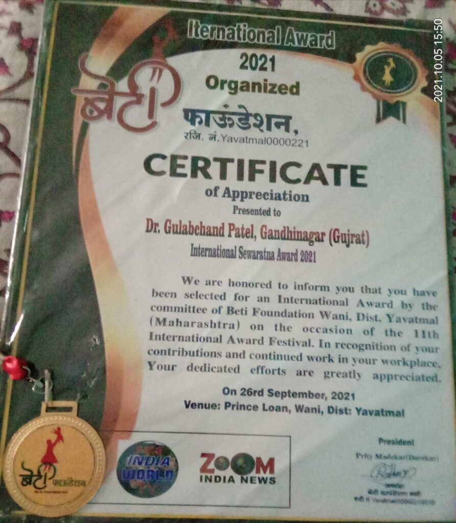 નગર ના સામાજિક કાર્યકર, વયસન મુક્તિ અભિયાન પ્રણેતા તેમજ મહિલાઓ માટે બ્રેસ્ટ કેન્સર અવેરનેસ પ્રોગ્રામ યોજનાર ભૂત પૂર્વ ઓફિસ સુપ્રિટેન્ડેંટ અમદાવાદ શહેર જિલ્લા શિક્ષણાધિકારી ઓફિસ, ઇંડિયન લાયન્સ ગાંધી નગર સ્વર્ણિમ કલબ ના ડાયરેક્ટર શ્રી, હિન્દી ગુજરાતી કવિ લેખક અને અનુવાદક, મહાત્મા ગાંધી સાહિત્ય સેવા મંચ ગાંધીનગર ના પ્રમુખ શ્રી, અખિલ ભારતીય ગુરુકુળ એવંમ ગૌ શાળા અનુસંધાન સંસ્થાન નોઈડા ના ગુજરાત પ્રદેશ અધ્યક્ષ, ભારત માતા અભિનંદન સંગઠન હરિયાણા ના ગુજરાત પ્રદેશ પ્રમુખ શ્રી ડૉ ગુલાબચંદ પટેલ ને મહારાષ્ટ્ર ની સામાજિક સંસ્થા બેટી ફાઉન્ડેશન વણી યવતમલ દ્વારા તેઓની સામાજિક અને સાહિત્યિક સેવાઓ ધ્યાનમાં રાખીને આંતરરાષ્ટ્રીય સેવા રત્ન એવોર્ડ – ૨૦૨૧ એનાયત કરવામાં આવ્યો છે.