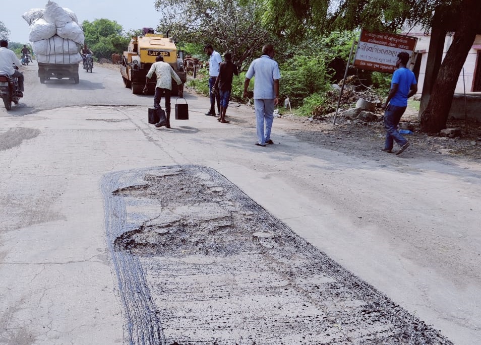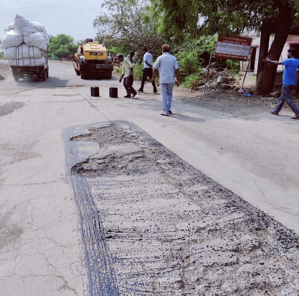તેના ભાગરૂપે આજે આર એન્ડ બી વીભાગના અધીકારી જોગરાણા સાહેબ ની હાજરી માં ડામર થી આ રોડ ઉપર પડેલ ગાબડા પુરવામાં આવી રહ્યા છે આર એન્ડ બી કચેરીના સાધનો સાથે તાત્કાલિક રીપેર કરવા માટે કામ ચાલુ કરવામાં માં આવ્યું