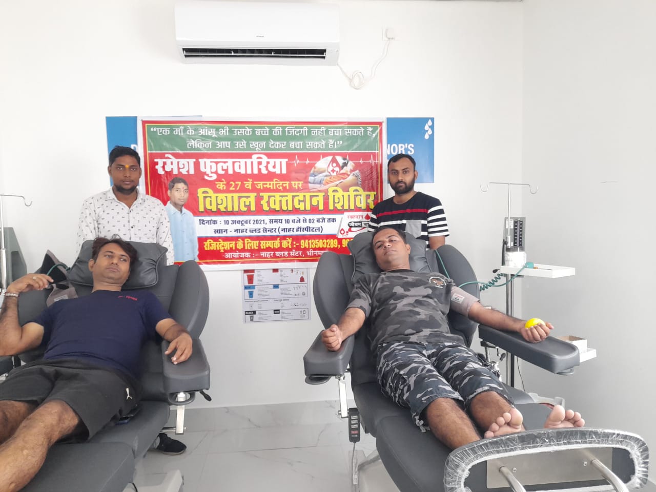 भीनमाल रक्तदान प्रभारी रमेश फुलवारिया के जन्मदिन पर 40 युवाओं ने रक्तदान कर जन्मदिन बनाया। युवाओ ने रक्तदान कर बताया कि रक्तदान करने से किसी प्रकार की कमियों नही होतो है व आने वाली युवा पीड़ि अपने जन्मदिन दिन पर होटलों में जाकर पैसे खर्च करते है इनसे अच्छा है कि आप किसी जरूरतमंद लोगों की सेवा कर अपने ऐतिहासिक दिन को यादगार बनावे इस मौके पर डॉ अनुराग जी
