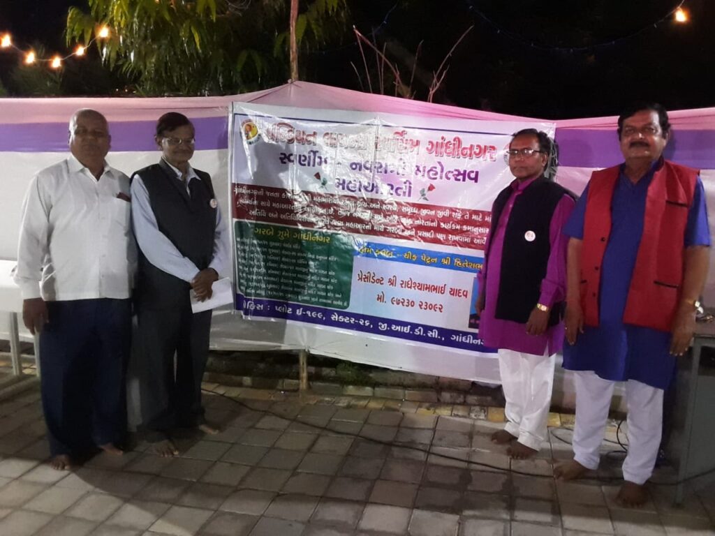 ઇંડિયન લાયન્સ ગાંધી નગર સ્વર્ણિમ કલબ ના ઇંડિયન લાયન્સ શ્રી રાજીવ ગુપ્તા જી (સ્પોર્ટ્સ ઇન્ડસ્ટ્રીઝ) ના પ્રાંગણ માં મહા આરતી કાર્યક્રમ પ્રમુખ શ્રી રાધેશ્યામ ભાઇ યાદવ, ડાયરેક્ટર શ્રી ડૉ ગુલાબચંદ પટેલ, ડાયરેક્ટર શ્રી મહેન્દ્ર ભાઇ ચૌહાણ, સેક્રેટરી શ્રી મહેન્દ્ર સિંહ સોલંકી, ઇ. લા. શ્રીમતી ઉષાબેન ચૌહાણ, શ્રીમતી આશાબેન, શ્રી નીમીશ ચૌહાણ નવા ચૂંટાયેલા કોર્પોરેટર મહાનગર ના શ્રી ગૌરાંગ વ્યાસ, શ્રીમતી પ્રેમલતા બેન મેહરીયા, શ્રીમતી ભાવના બા ગોલ, શ્રી વિક્રમ સિંહ ગોલ, શ્રી મફત ભાઇ દેસાઇ, શ્રી ઉમેશ ગુપ્તા જી, શ્રી સંદિપ ગુપ્તા તથા રાજીવ ગુપ્તા જી અને સંપૂર્ણ પરિવાર, વસાહત ના ભઈ બહેનો મોટી સંખ્યામાં ઉપસ્થિત રહ્યા હતા