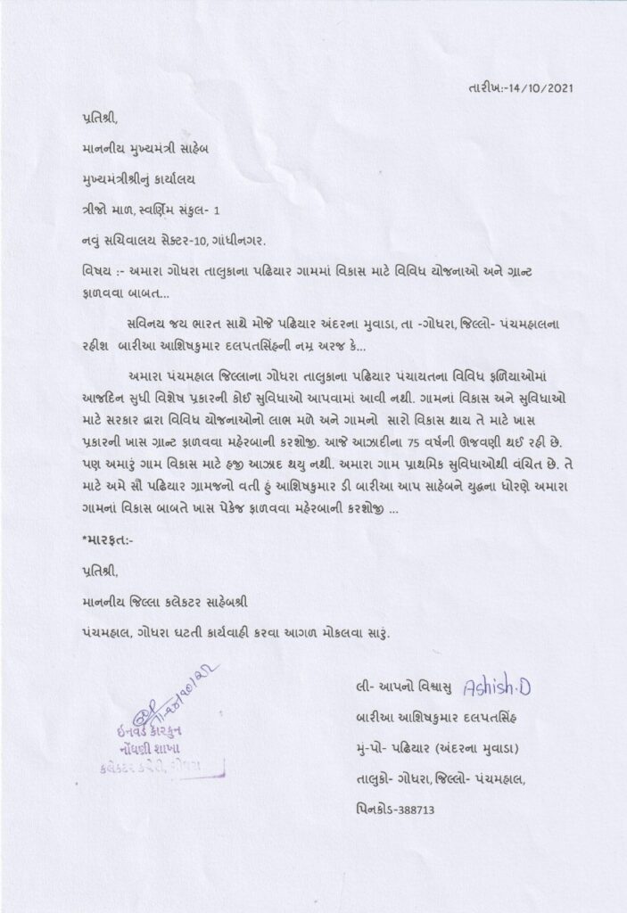 પઢિયાર તા ગોધરા ગામના વિકાસ માટે વિકાસલક્ષી ગ્રાન્ટો ફાળવવા સરકારને રજુઆત, ગામનાં જાગૃત યુવાન આશિષકુમાર બારીઆએ મુખ્યમંત્રીને લખ્યો પત્ર