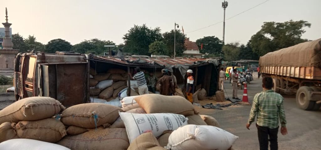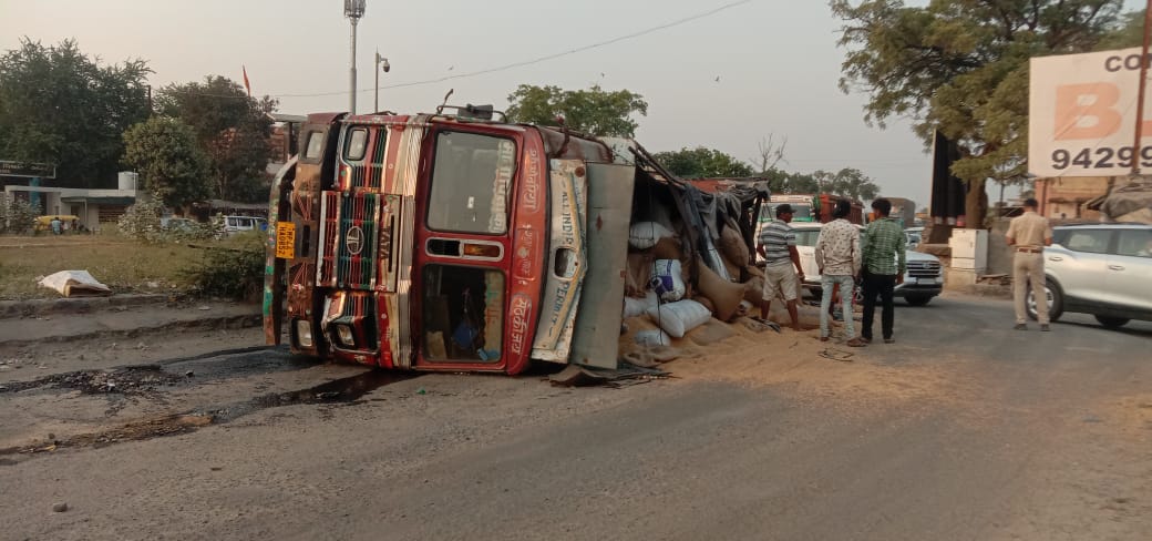 પાલનપુર આર.ટી.ઓ સર્કલ પાસે સરકારી અનાજ ભરેલું ટ્રક પલટી ખાઈ ગઈ