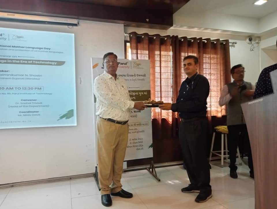 ઇજનેરી વિદ્યાના વિદ્યાર્થીઓને માતૃભાષા દિવસ સંદર્ભે પાવર પોઇન્ટ પ્રેઝન્ટેશન સાથે ગોધરાના કવિ અને વિવેચક શ્રી ડૉ કુમાર જૈમિનિ શાસ્ત્રીએ માતૃભાષાદિવસની ઉજવણીના ઉપલક્ષમાં માતૃભાષાના વિકાસ, સંવર્ધન,શિક્ષણ અને સમાજમાં તેનું મૂલ્ય તેમજ તેના મહત્વ જેવા અનેક પાસાઓને વણી લઈને વ્યાખ્યાન આપ્યું હતું. પારુલ યુનિવર્સિટી ખાતે યોજાયેલ આ વ્યાખ્યાનમાં મોટી સંખ્યામાં રસિકો જોડાયા હતા.