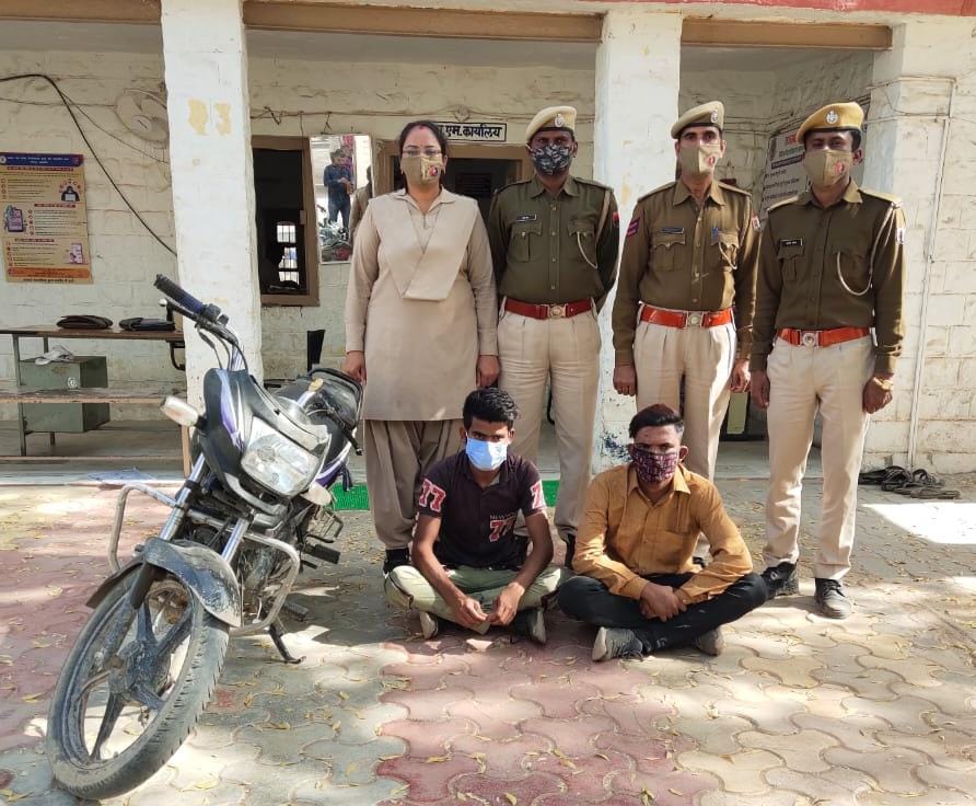 रानीवाड़ा में दिन दहाड़े धक्का मारकर बाइक लेकर भागने वाले व खरीददार को पुलिस ने किया गिरफ्तार जिला पुलिस अधीक्षक हर्षवर्धन अग्रवाला के आदेशानुसार रानीवाडा कस्बे मे हुई मोटरसाईकिल चोरियो की वारदात का खुलासा करने हेतु अतिरिक्त पुलिस अधीक्षक दशरथसिंह व रानीवाडा वृताधिकारी शंकरलाल के सुपरविजन में थानाधिकारी पदमाराम के नेतृत्व मे गठित पुलिस टीम हैड कानिस्टेबल वणाराम, कानिस्टेबल आसुराम, आमद खान, भुपाराम, जगदीश कुमार ने कस्बे मे हुई मोटर साईकिल चोरी के आरोपी व चोरी की मोटर साईकिल के खरीददार को गिरफतार किया। उक्त आरोपियों के कब्जे से चोरी की एक मोटर साईकिल बरामद की गई। थानाधिकारी ने बताया कि कस्बे मे हुई मोटरसाईकिल चोरियो की वारदात का खुलासा करने को लेकर पुलिस टीम ने मोटर साईकिल चोरी के आरोपी हिंगलाज नगर सब्जी मंडी के पास सांचौर निवासी अम्बालाल उर्फ ओबा उर्फ अनिल कुमार पुत्र वसराज सेन व चोरी की मोटर साईकिल के खरीददार झेरडिया निवासी करण कुमार पुत्र दशरथ कुमार लौहार को गिरफ्तार कर अन्य वारदातों के सम्बंध मे पूछताछ जारी हैं। आरोपियों से चोरी की अन्य वारदातों के खुलासा होने की सम्भावना हैं।