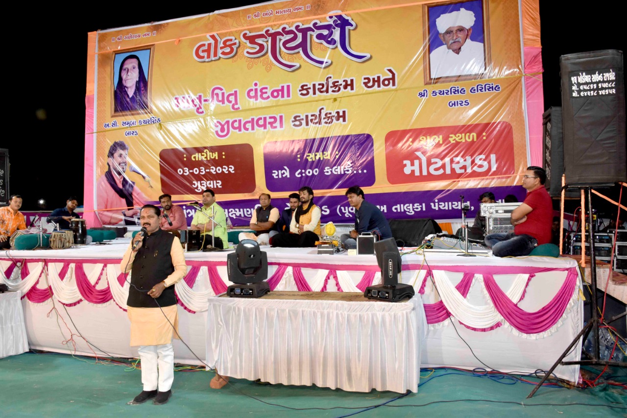 દાંતા તાલુકા પંચાયતના પૂર્વ પ્રમુખશ્રી એલ.કે.બારડના માતૃશ્રી સમુબા કચરસિંહ બારડ અને પિતાશ્રી કચરસિંહ હરીસિંહ બારડના જીવતરાના કાર્યક્રમમાં લોક સાહિત્યકારશ્રી રાજભા ગઢવીએ ડાયરાની રમઝટ બોલાવી મોજ કરાવી
