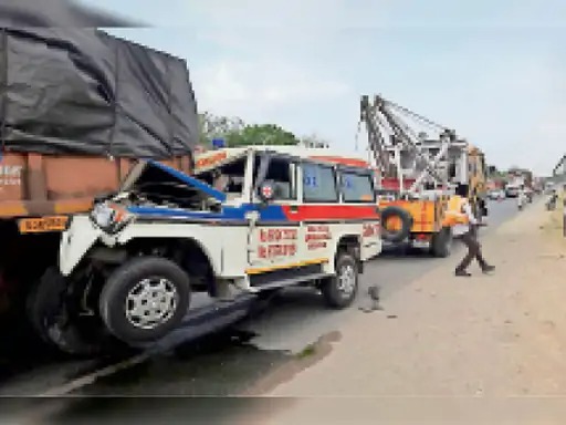 तेज़ रफ्तार एंबुलेंस ट्रक के पीछे घुस गई। हादसे में एंबुलेंस के आगे का हिस्सा क्षतिग्रस्त हो गया और चालक घायल हो गया।