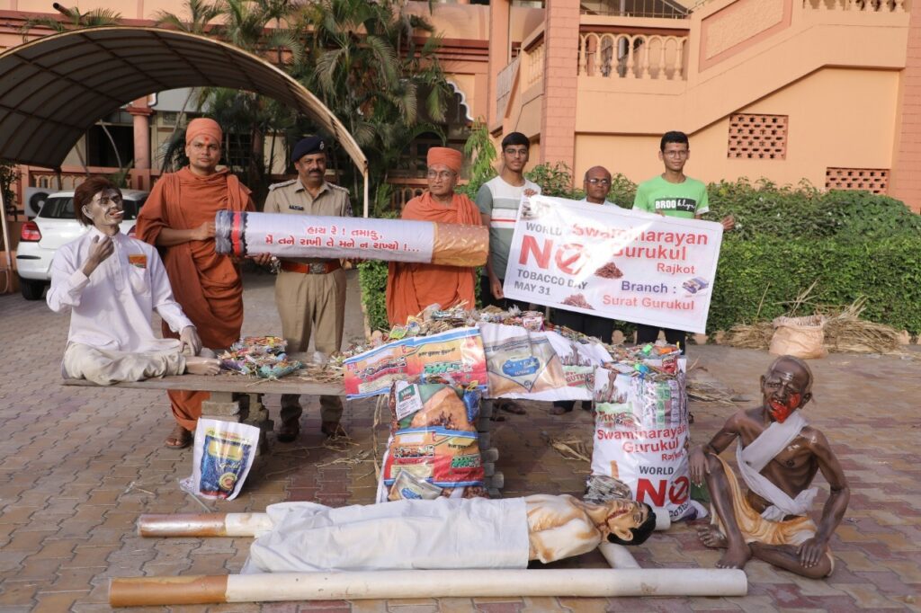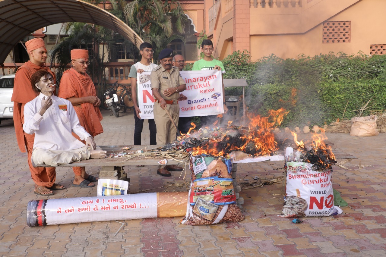 સુરત:મંગળવાર: તા.૩૧મી મે-વિશ્વ ટોબેકો નિષેધ દિવસે વેડરોડ સ્વામિનારાયણ ગુરૂકુલમાં “હાય રે તમાકુ ! મેં તને રાખી, તે મને ન રાખ્યો!?’ વિષય પર યુવા પેઢીને તમાકુના દુષ્પરિણામોની સમજ આપતો જનજાગૃત્તિ કાર્યક્રમ યોજાયો હતો. આસી.પોલીસ કમિશનરશ્રી આર.આર.આહીરની તેમજ સંતોની ઉપસ્થિતિમાં બીડી, સિગારેટ, તમાકુ, ગુટખા, માવા વગેરેના સેવનથી માણસને અગ્નિદાહ દેવો પડે તે પહેલા શ્રી સ્વામિનારાયણ ગુરૂકુલમાં બીડી, સિગારેટ, ગુટખાના જથ્થાને અગ્નિદાહ આપી જીવનમાંથી પણ આ દૈત્યને સદાને માટે તિલાંજલિ આપવાનો સંદેશ આપવામાં આવ્યો હતો.