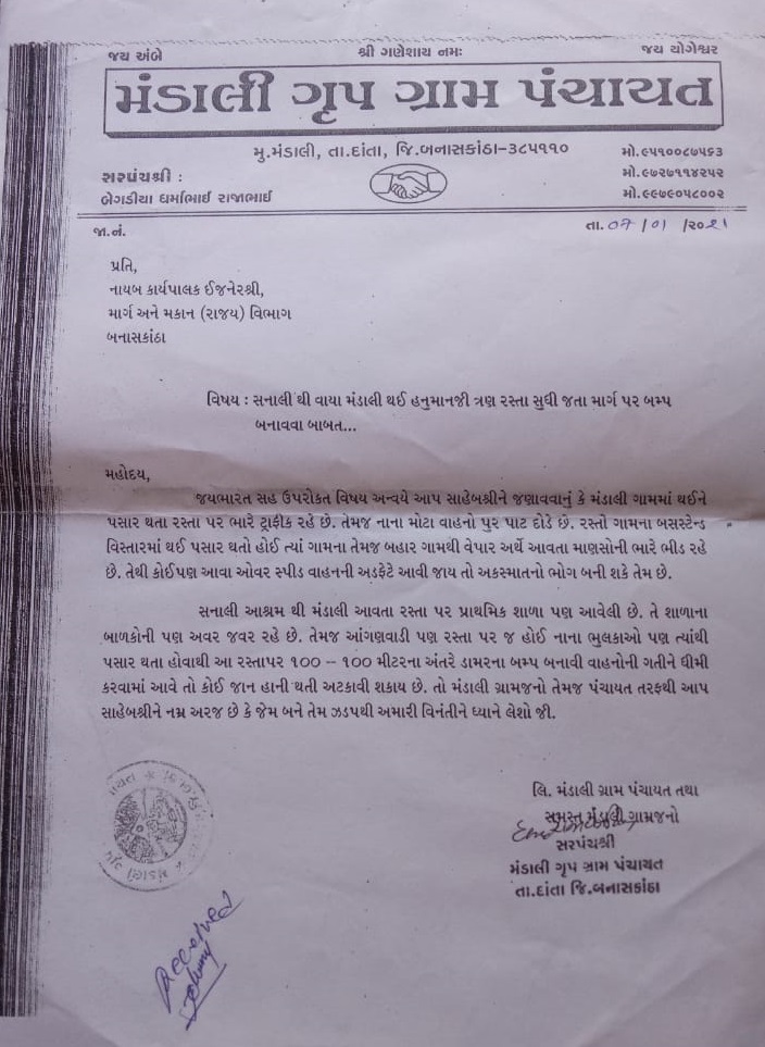 દાંતા તાલુકાના મંડાલી ગામ માં થઈને પસાર થતા રસ્તા પર બંપ બનાવવા માટે એક વર્ષ પહેલાં PWD વિભાગ ને રજુઆત કરાઈ હતી